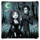 A dark, whimsical illustration features a couple dressed in gothic attire against a haunted backdrop. The moonlit scene includes bats and a mysterious mansion, enhancing the eerie vibe.