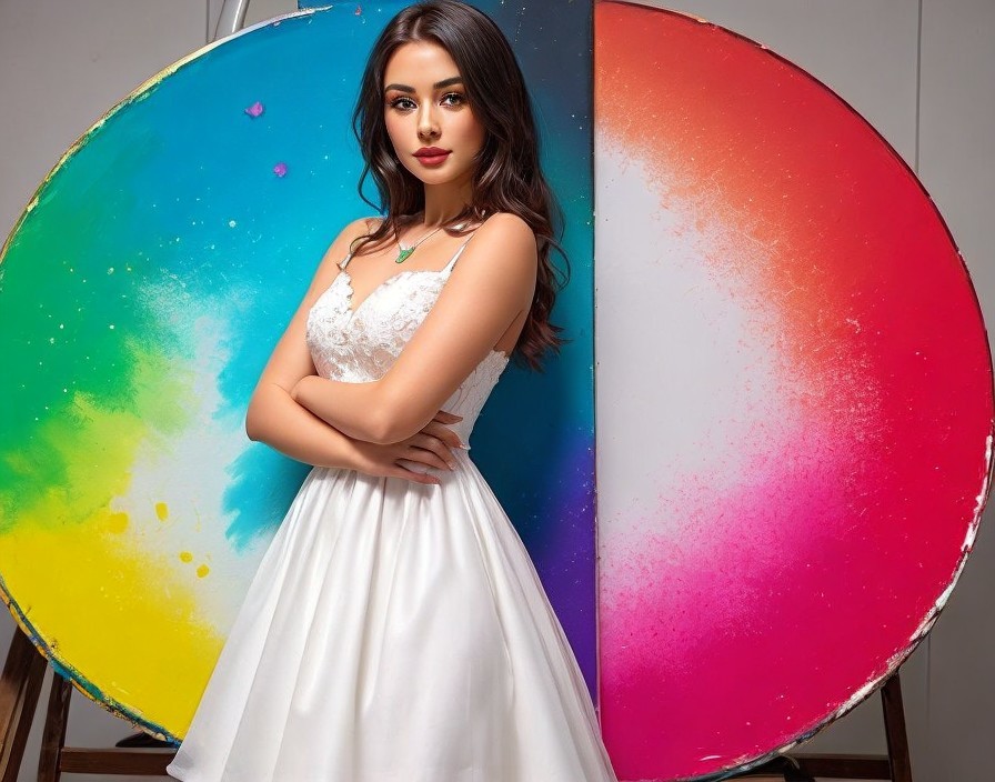 Woman in white dress with colorful paint splashes on vibrant backdrop