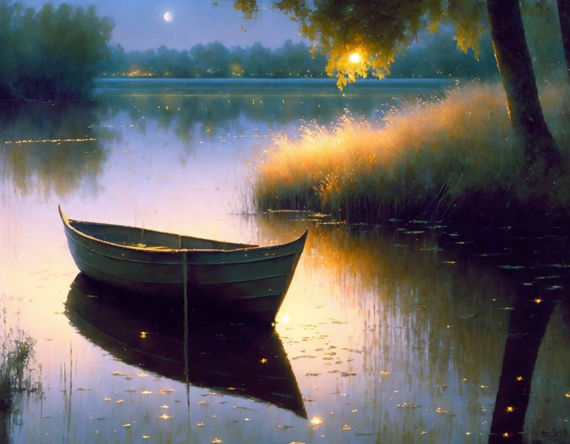 Prompt: "Envision a quiet riverside scene under the gentle glow of the moon. Describe the reflections on the water, the rustling reeds, and the tranquility of the sleeping surroundings, global illumination, detailed and intricate environment"