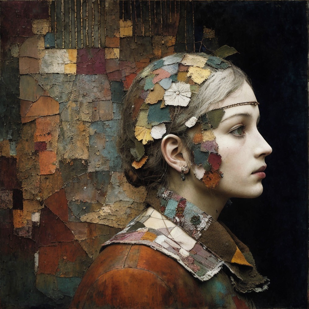 A young girl in profile, wearing a simple brown coat and a colorful headband. The background features abstract patches of warm and cool colors, creating a vintage, artistic ambiance.