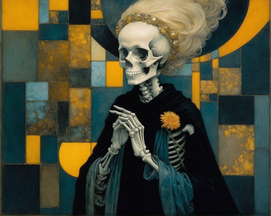 A skeletal figure draped in dark fabric stands against an abstract background of geometric shapes and vibrant colors. Its hair flows dramatically, suggesting a sense of mystery and depth.