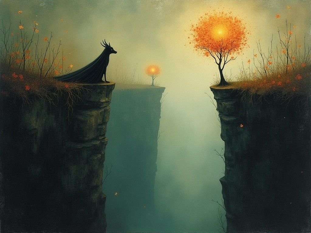 In a surreal landscape, two figures stand on opposite cliffs overlooking a tranquil sea. One holds flowers, while the other sits beneath a golden tree, bathed in the warm glow of a large sun.