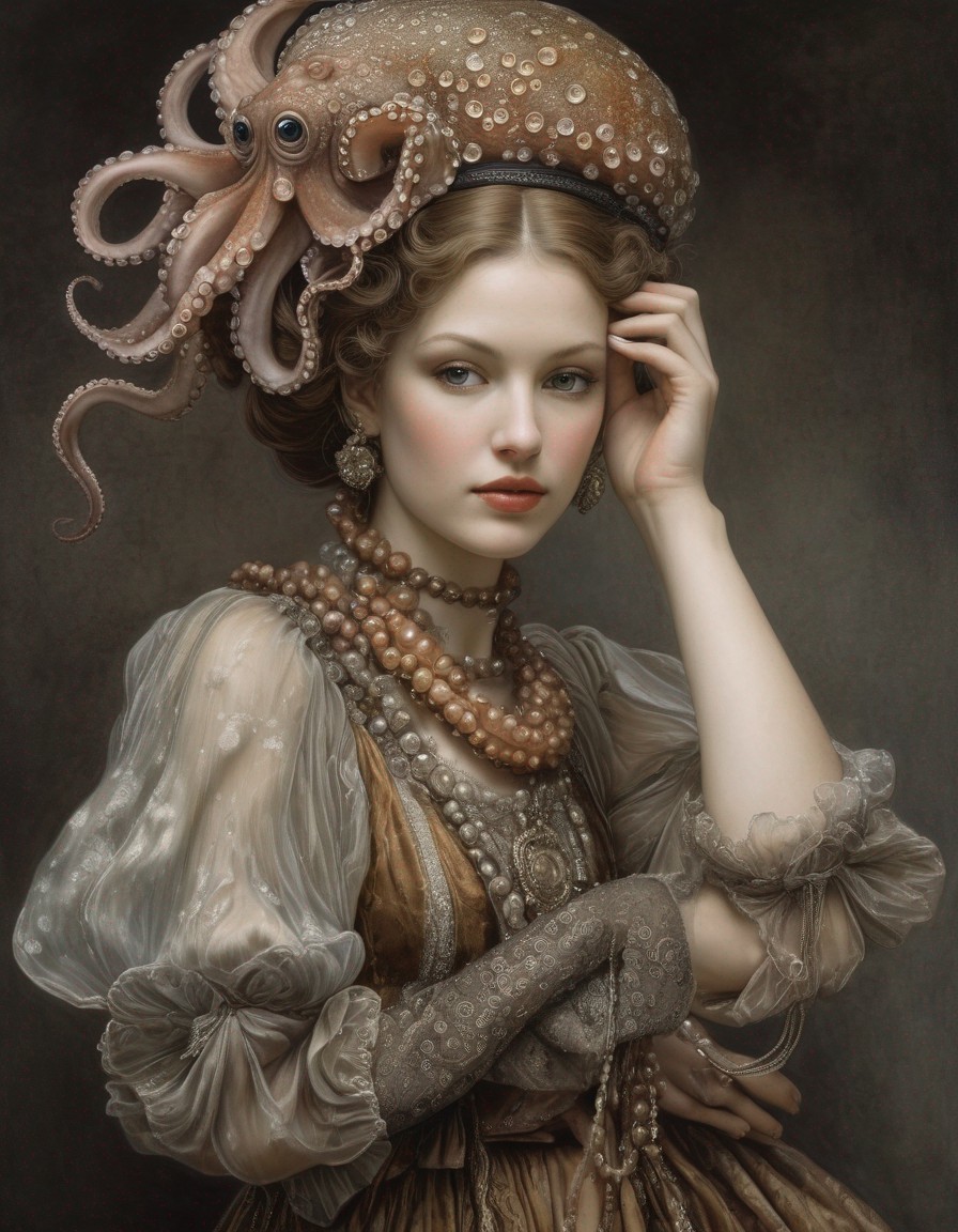 A woman with curly red hair in a Victorian dress with octopus elements against a sea backdrop.