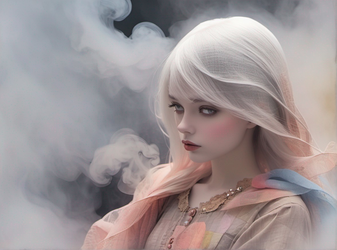 Prompt: Mysterious woman’s portrait in smoke and gossamer, patchwork nostalgia and impasto, art brut, moody, somber, desaturated colors, in the style of Paul Klee, Arthur Rackham, Tim Burton, Banksy