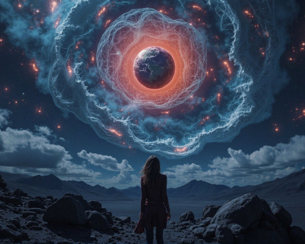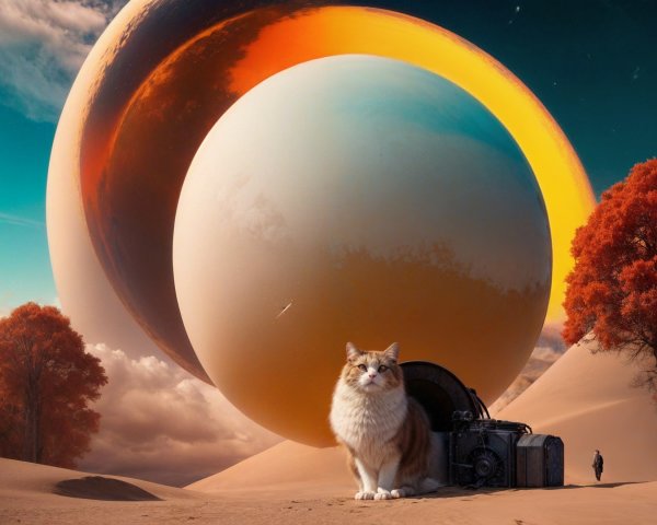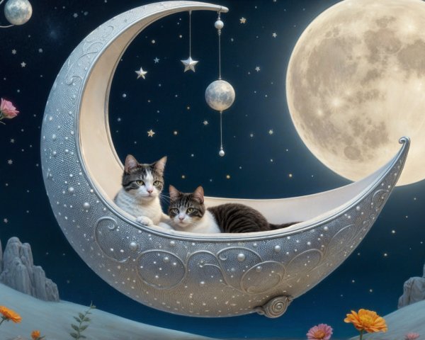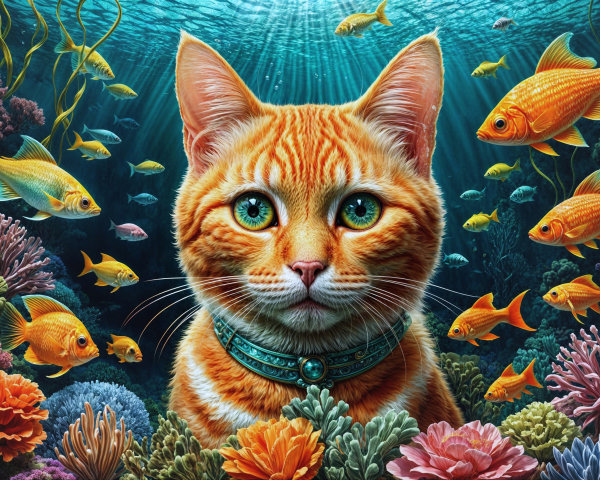 A serene forest scene illuminated by soft purple lights and blossoming flowers, featuring an orange cat sitting calmly amidst the enchanting atmosphere, creating a magical, dreamlike setting.