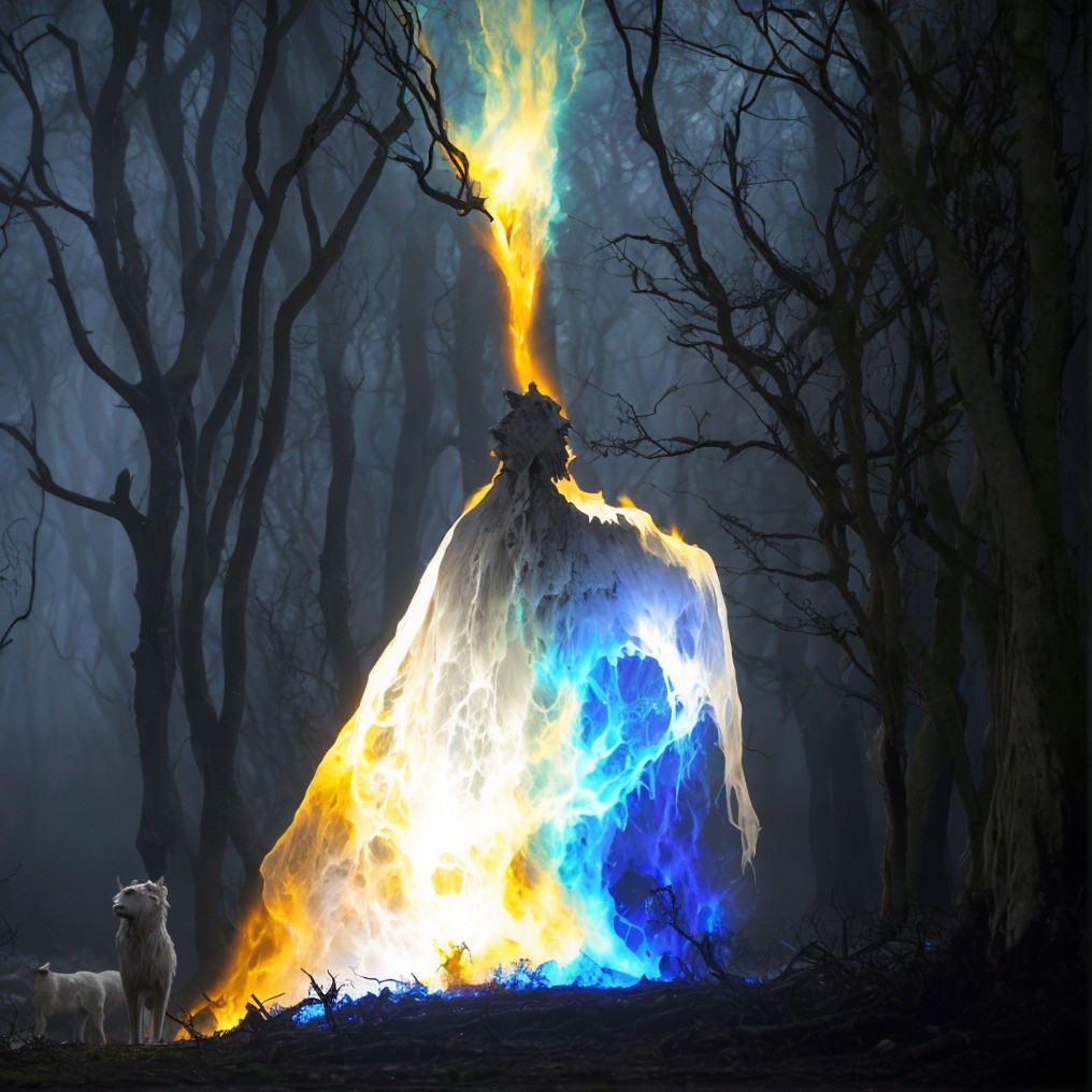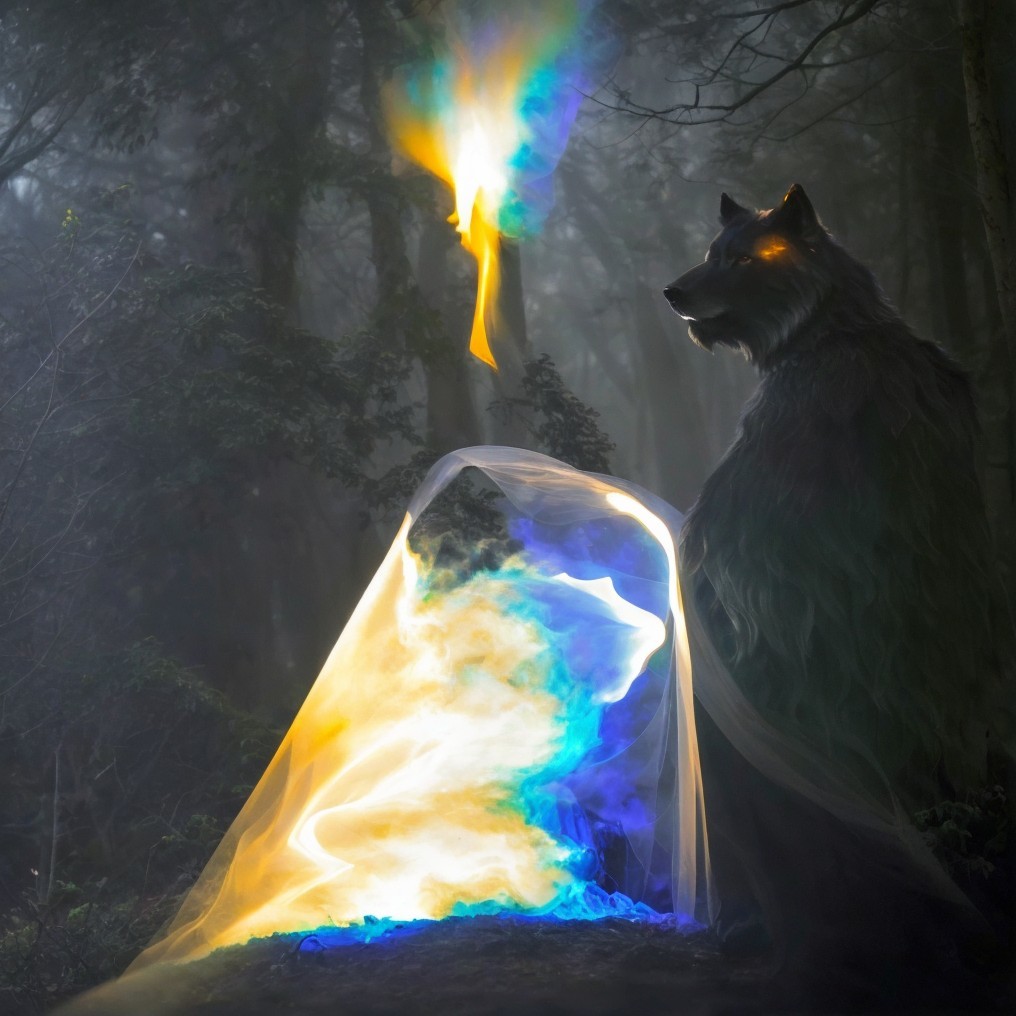 + Prompt:electromagnetic smoke vortex ring vortices Create an image of a mysterious figure standing in a dark, foggy forest. The figure has the head of a wolf, with piercing amber eyes and a detailed, realistic fur texture. The wolf's face is illuminated by an ethereal glow emanating from behind it, creating a striking contrast against the shadowy surroundings. The figure is draped in a long, flowing dark cloak that blends into the darkness, with subtle textures that suggest a fabric-like quality.