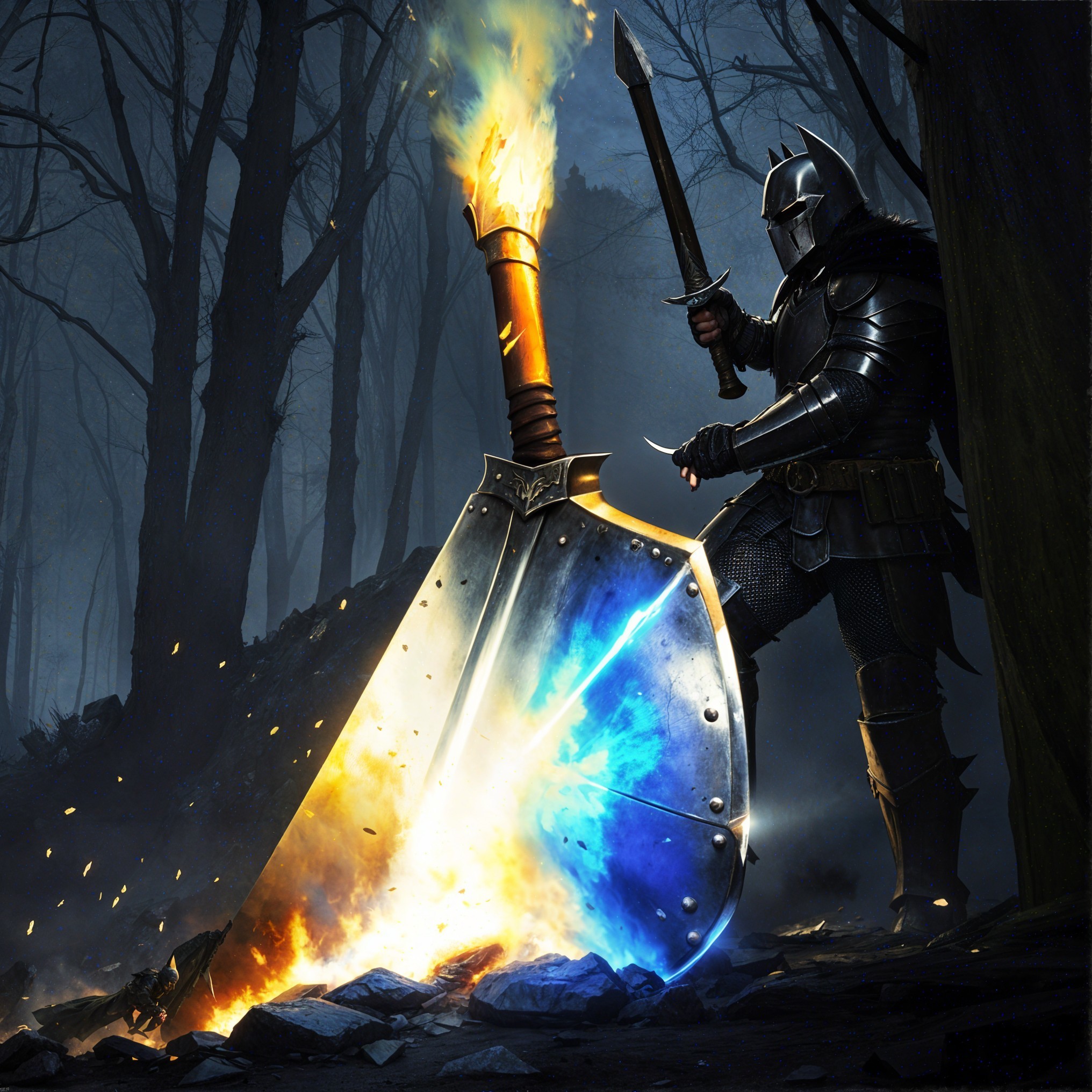 In one hand, it holds a tall, slender spear, adding an element of strength and power. The background features dark silhouettes of trees, with faint glimmers of light that suggest fireflies or distant lights, enhancing the enchanting atmosphere. The ground is covered with pale, moss-like foliage, creating an otherworldly feel. Ensure the composition emphasizes the figure's commanding presence while maintaining the eerie, magical ambiance of the forest.