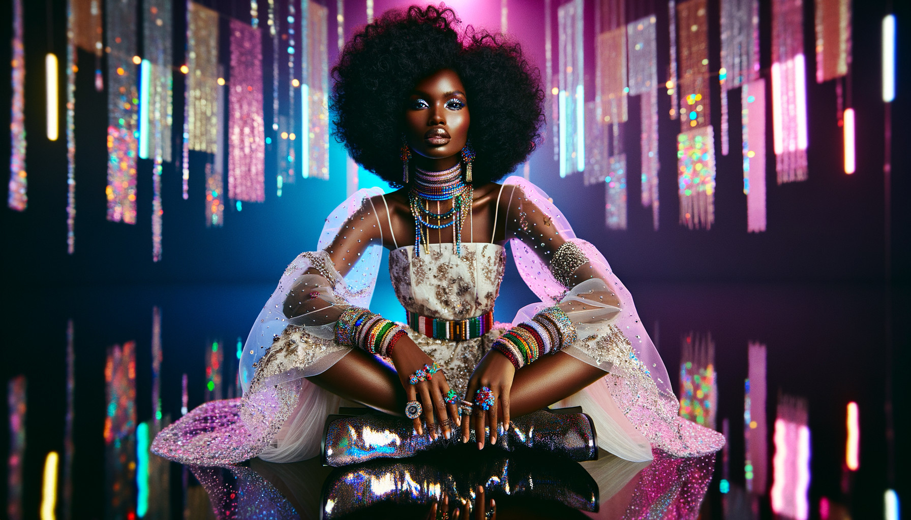 A woman with voluminous curly hair poses in a dazzling outfit with reflective accessories, against a neon-lit backdrop.