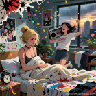 A vibrant, chaotic bedroom scene with two young women. One is joyfully dancing, while the other sits among splattered paint and confetti, both surrounded by colorful art and urban aesthetics.