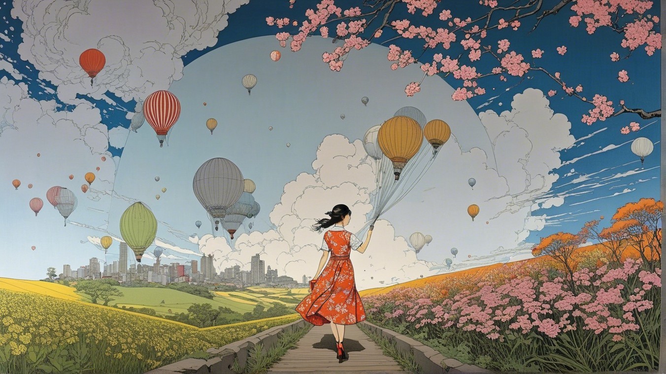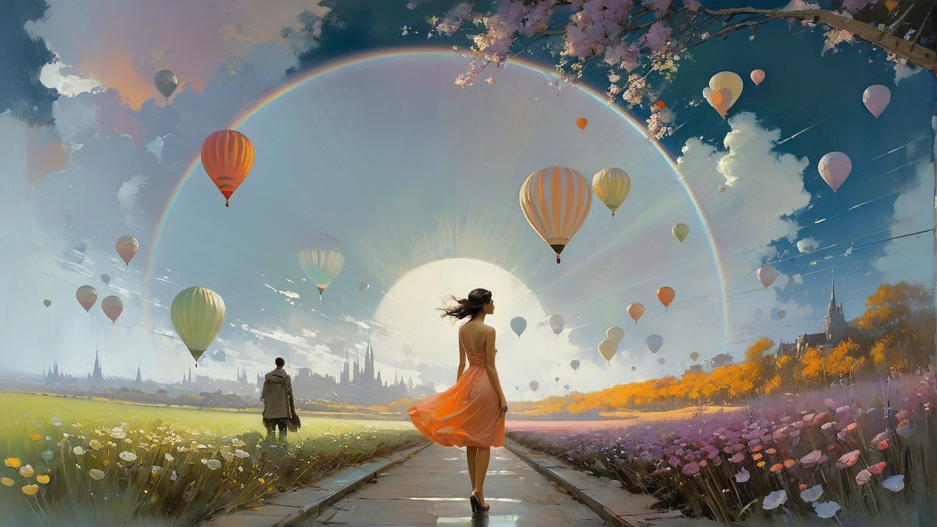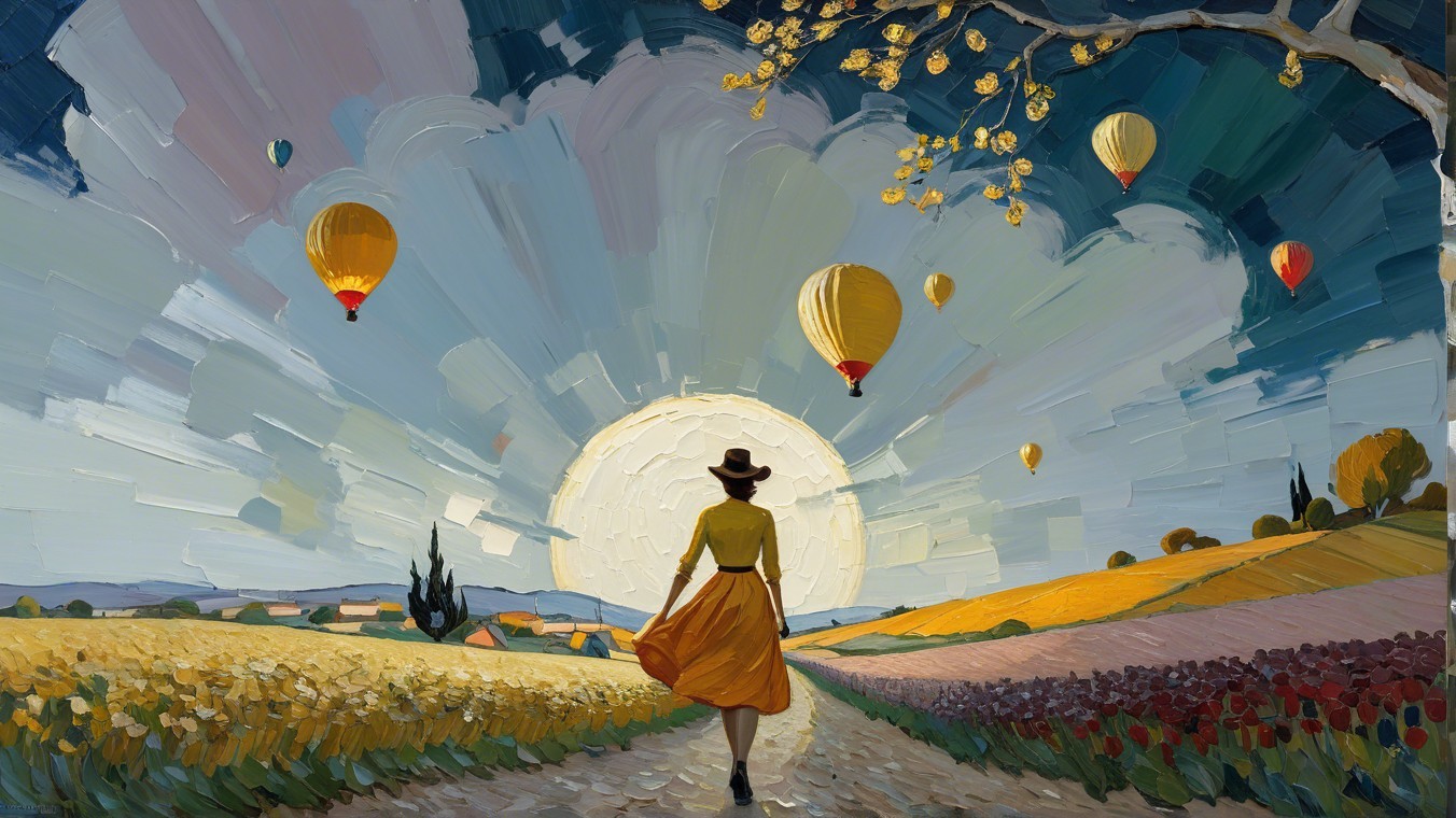 A woman in a red dress walks along a path through vibrant fields of tulips under a bright sky filled with colorful hot air balloons. The sun rises, casting a warm glow on the scenery.