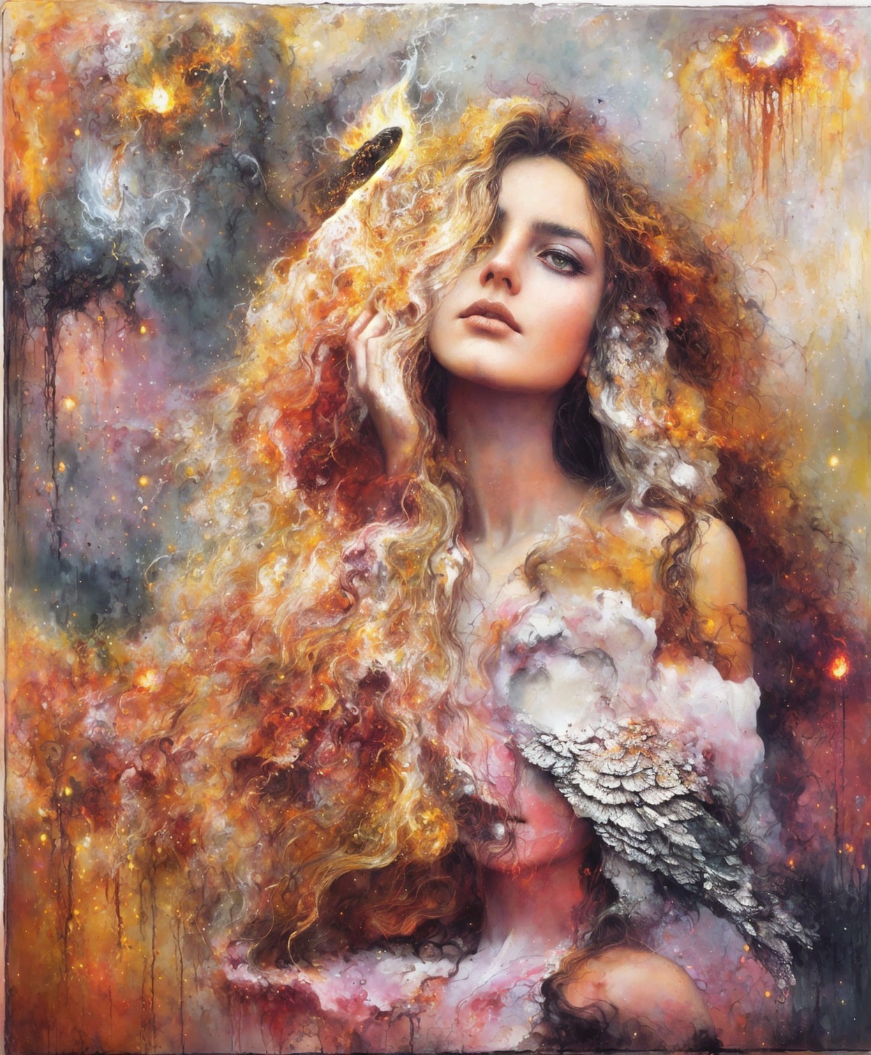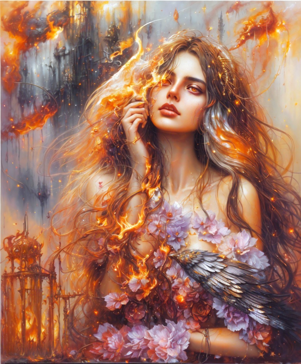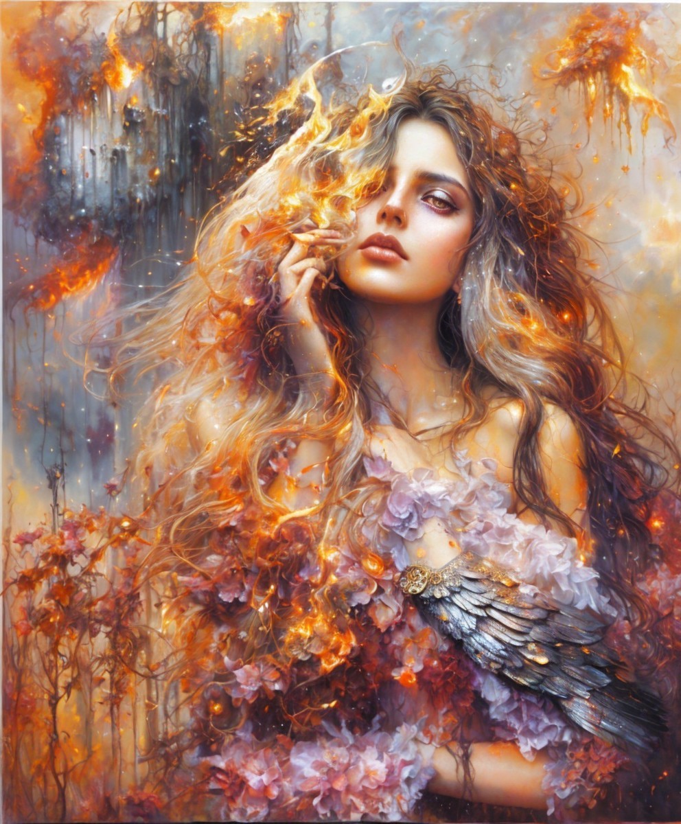Prompt: Occult, goddess who gets her strength from the mixture of fire and nature, messy hair, fire place, peace, surrender, ultra-beautiful facial features, sparkling golden highlights