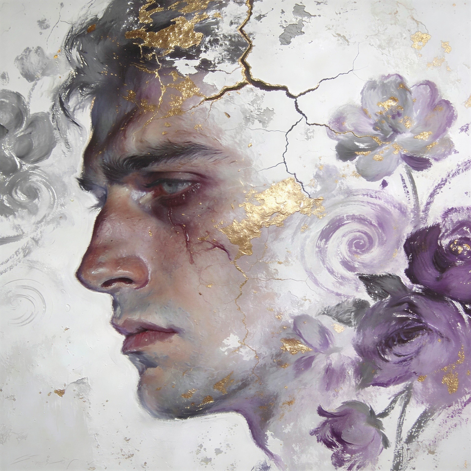 A highly detailed oil painting of a masculine face, turned in profile facing left, with realistic features, a pronounced brow, straight nose, and full lips, set against an abstract background of white and delicate purple and grey flowers. The man's hair is dark grey with hints of purple and gold leaf