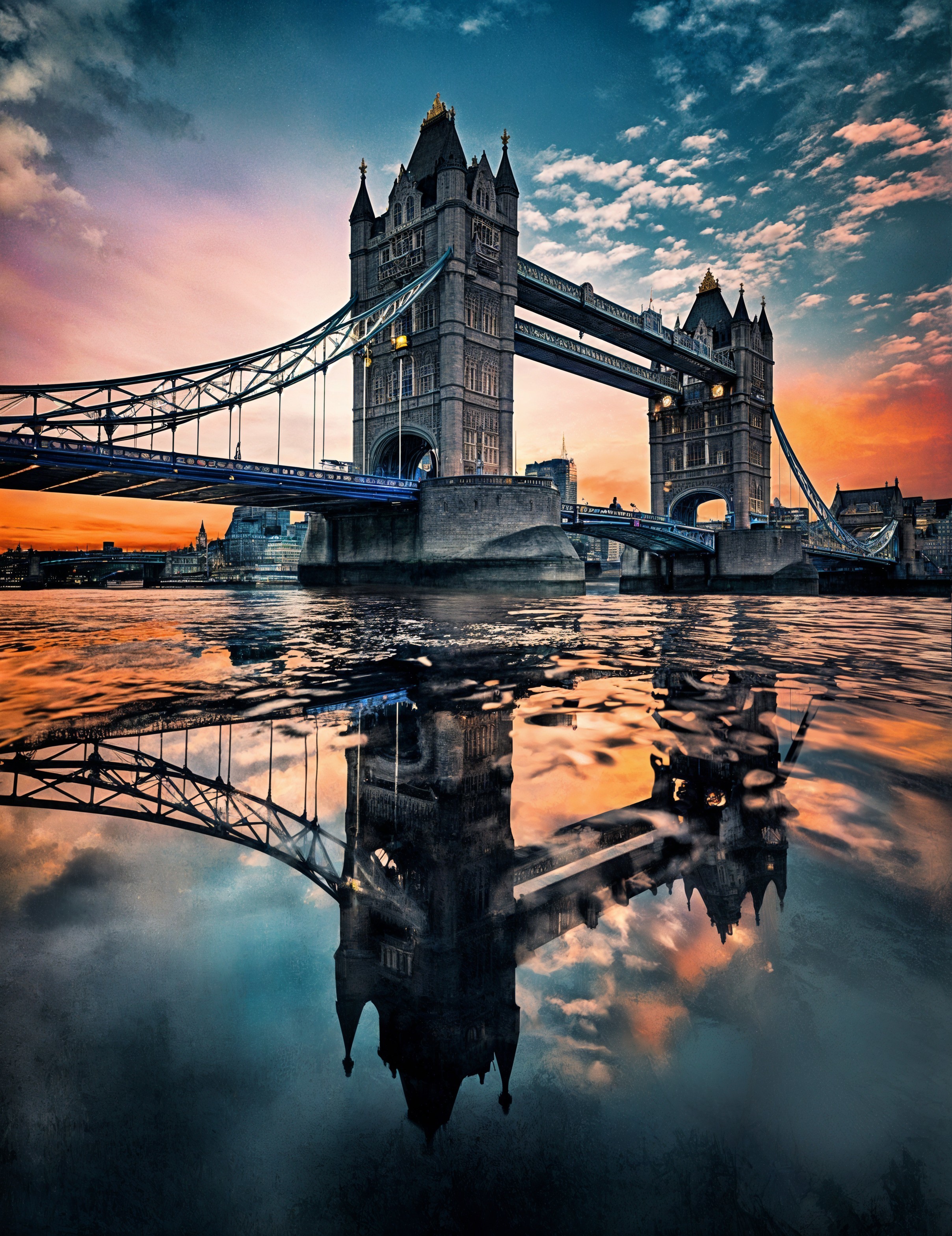 Majestic Tower Bridge at dusk, iconic landmark, River Thames reflections, double-decker buses passing, bustling cityscape, intricate steel structure, Victorian architecture, vibrant city lights, urban skyline, evening atmosphere, digital art, high resolution, dynamic angles, rich color palette of blues, golds, and purples, dramatic lighting, detailed textures, modern vintage fusion, by Banksy and Shepard Fairey, Artstation.