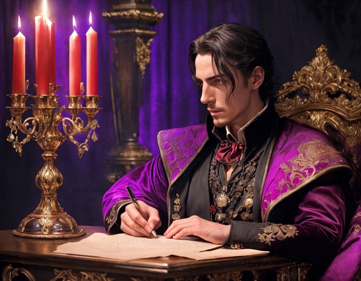Prompt: "A handsome and noble Count awakening in an opulent luxurious candlelit chamber to pen a hateful letter in deep black ink. Purple gold and red colour palette, juxtaposed with the stark monochrome of the letter and ink."