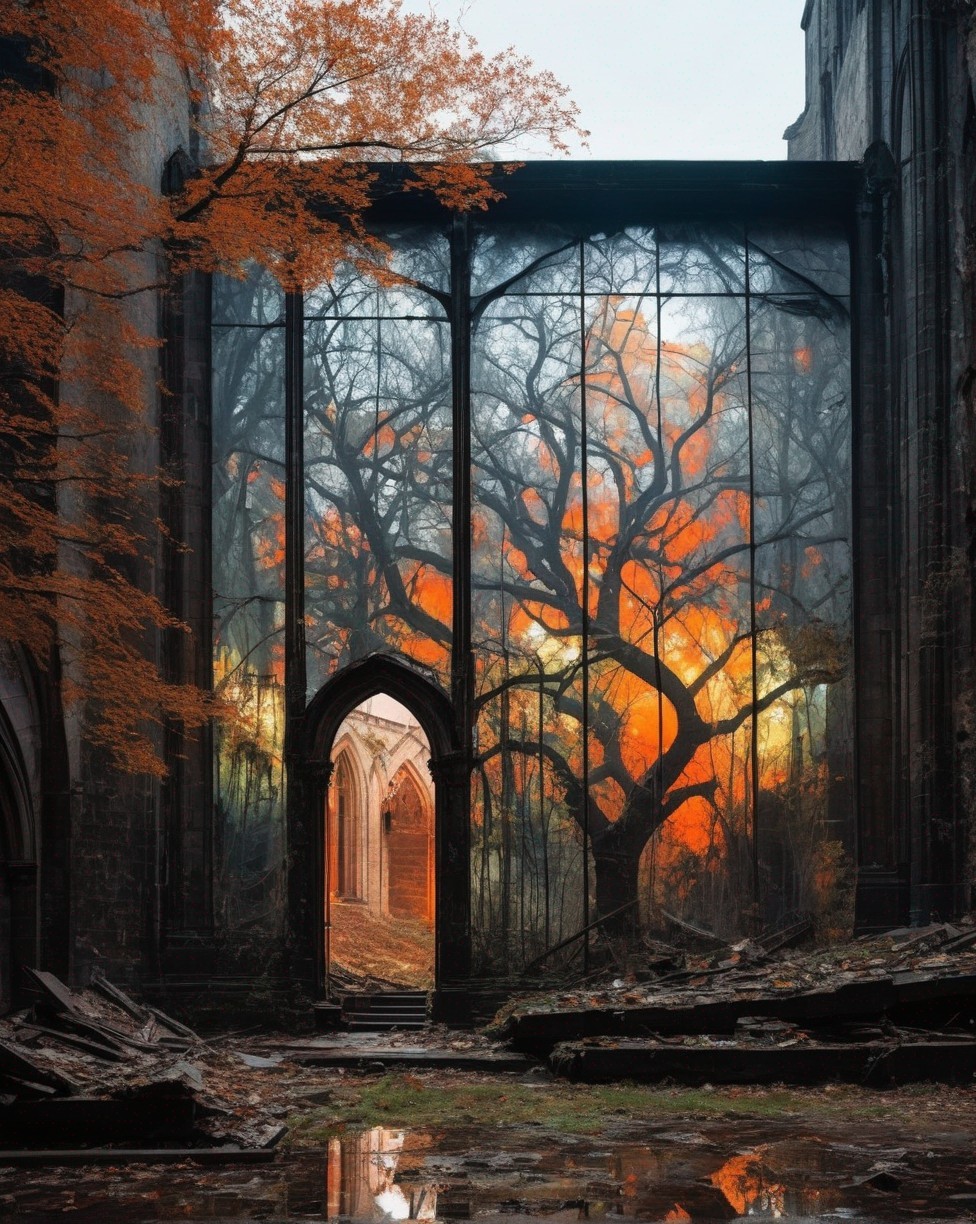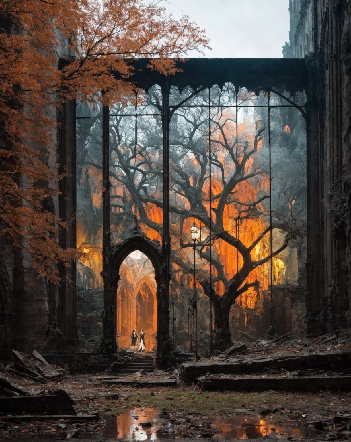 Gothic ruins in autumnal setting with misty backdrop and solitary figure.