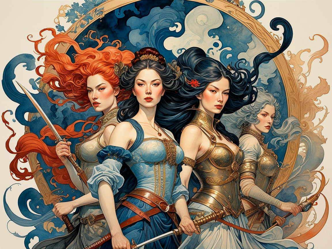 Experience a captivating realm of mighty female warriors inspired by the 18th century, blending whimsical storytelling and mystical artistry in vibrant, fluid watercolors and intricate details.