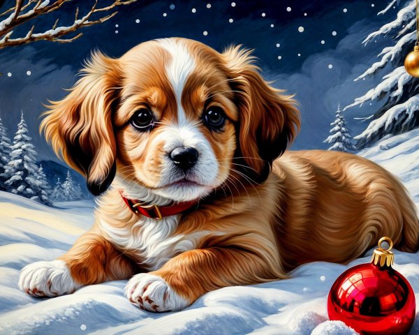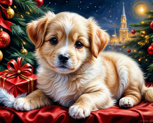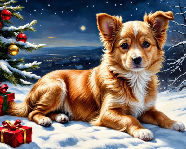 A fluffy, black and tan puppy with striking eyes poses in a snowy scene, surrounded by festive Christmas decorations and trees, creating a cozy holiday atmosphere.