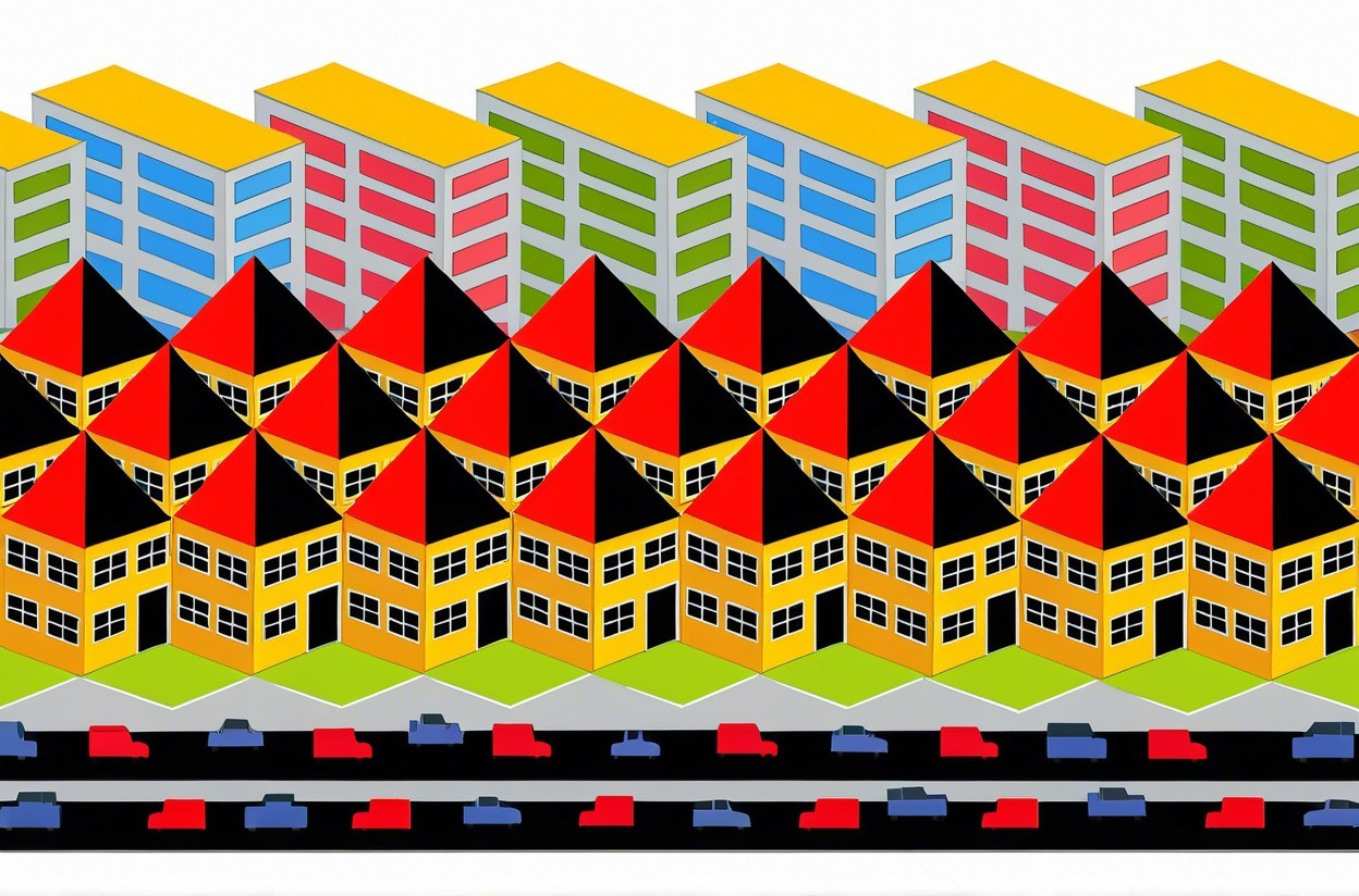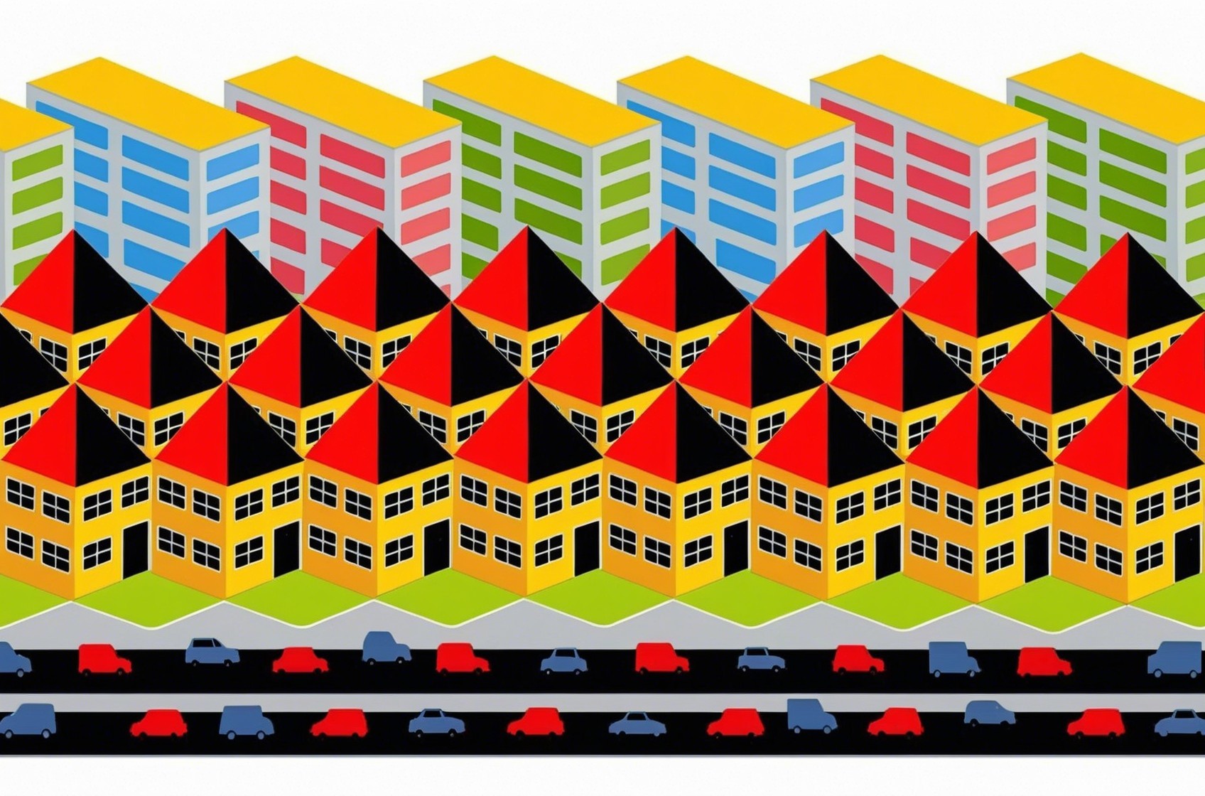 An abstract cityscape features colorful buildings with distinctive red rooftops and stylized cars on a black road, creating a vibrant and playful urban scene.