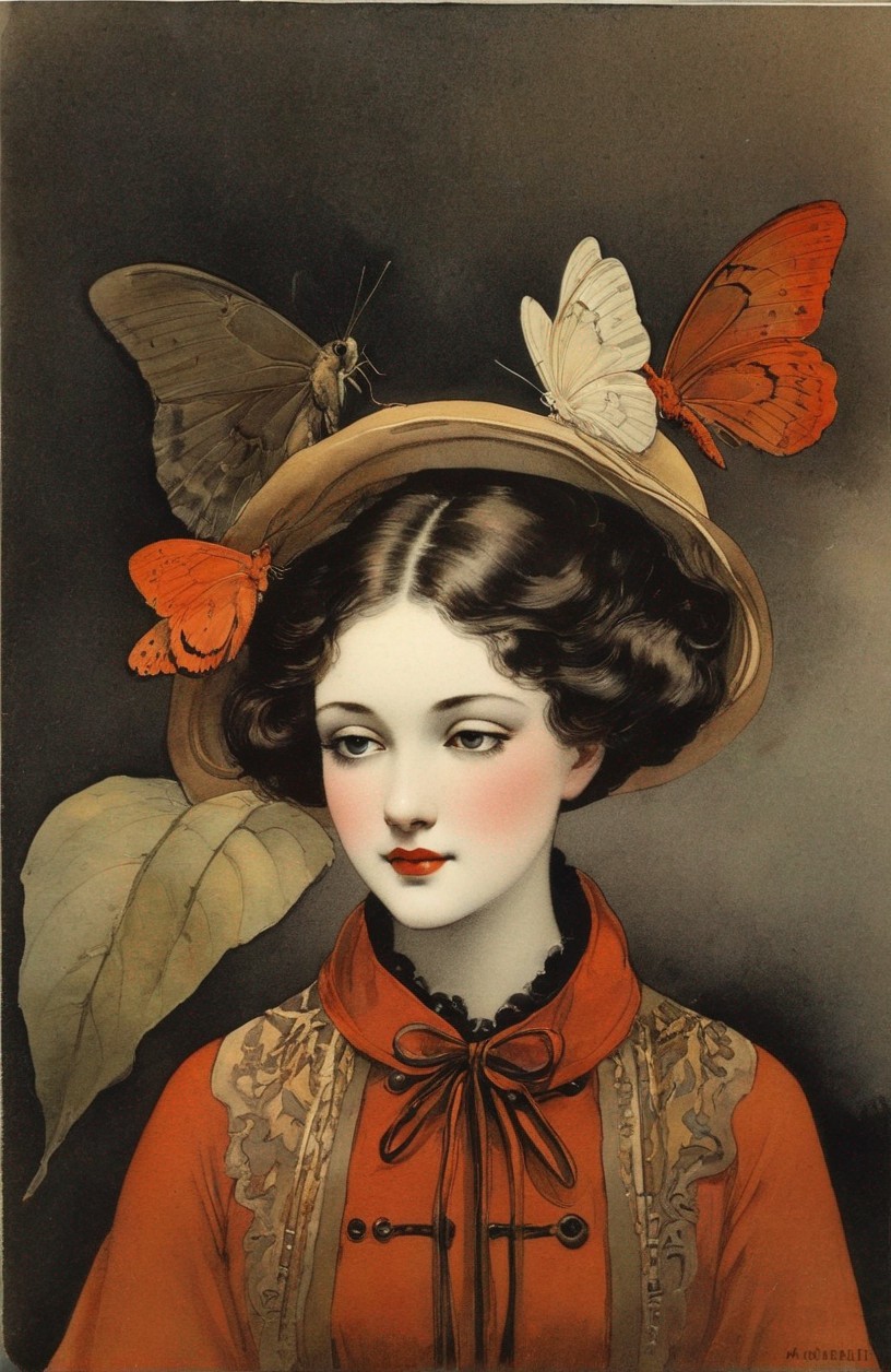 A vintage illustration of a woman with a butterfly motif, featuring large wings as a hair accessory and subtle butterfly patterns on her attire.