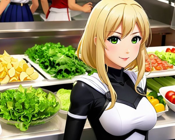 A charming character in a stylish strapless swimsuit, set against an industrial backdrop. Her playful expression and vibrant colors contrast with the urban elements, creating a unique visual appeal.