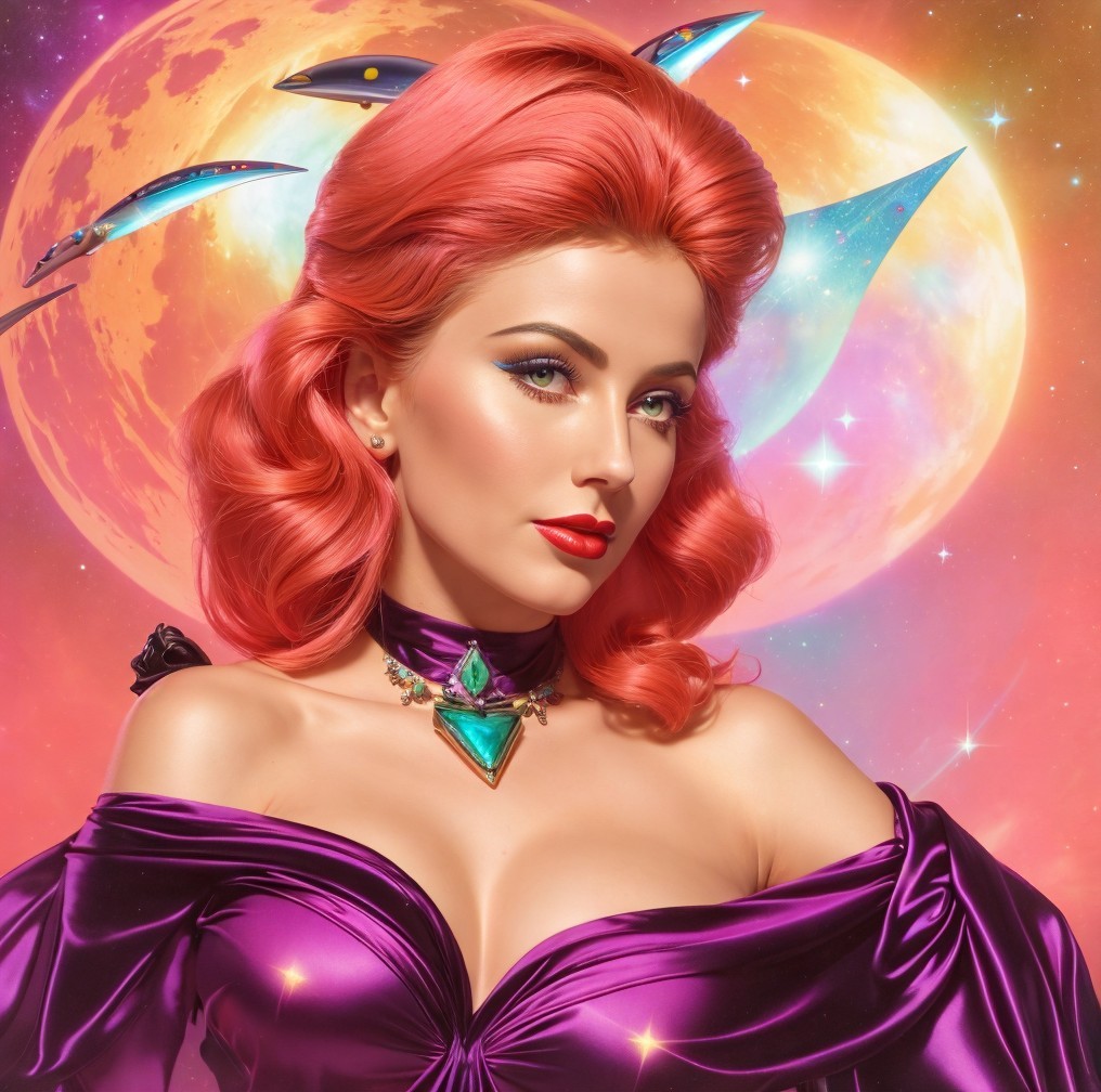 A stylized portrait of a woman with red hair, celestial accessories, dramatic makeup, and a purple dress, against a cosmic background.