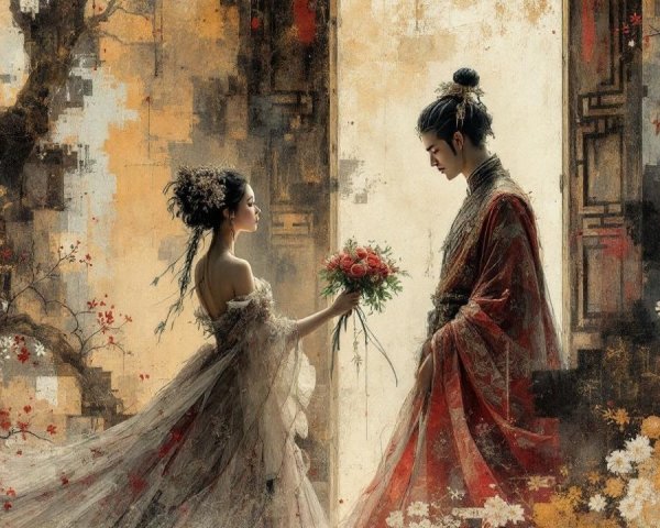 Black and Gold Vase with Tulips and Decorative Objects on Dark Background