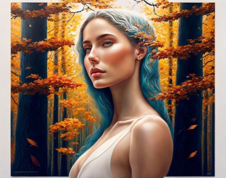 A woman with blue braided hair in an autumnal forest filled with golden leaves.