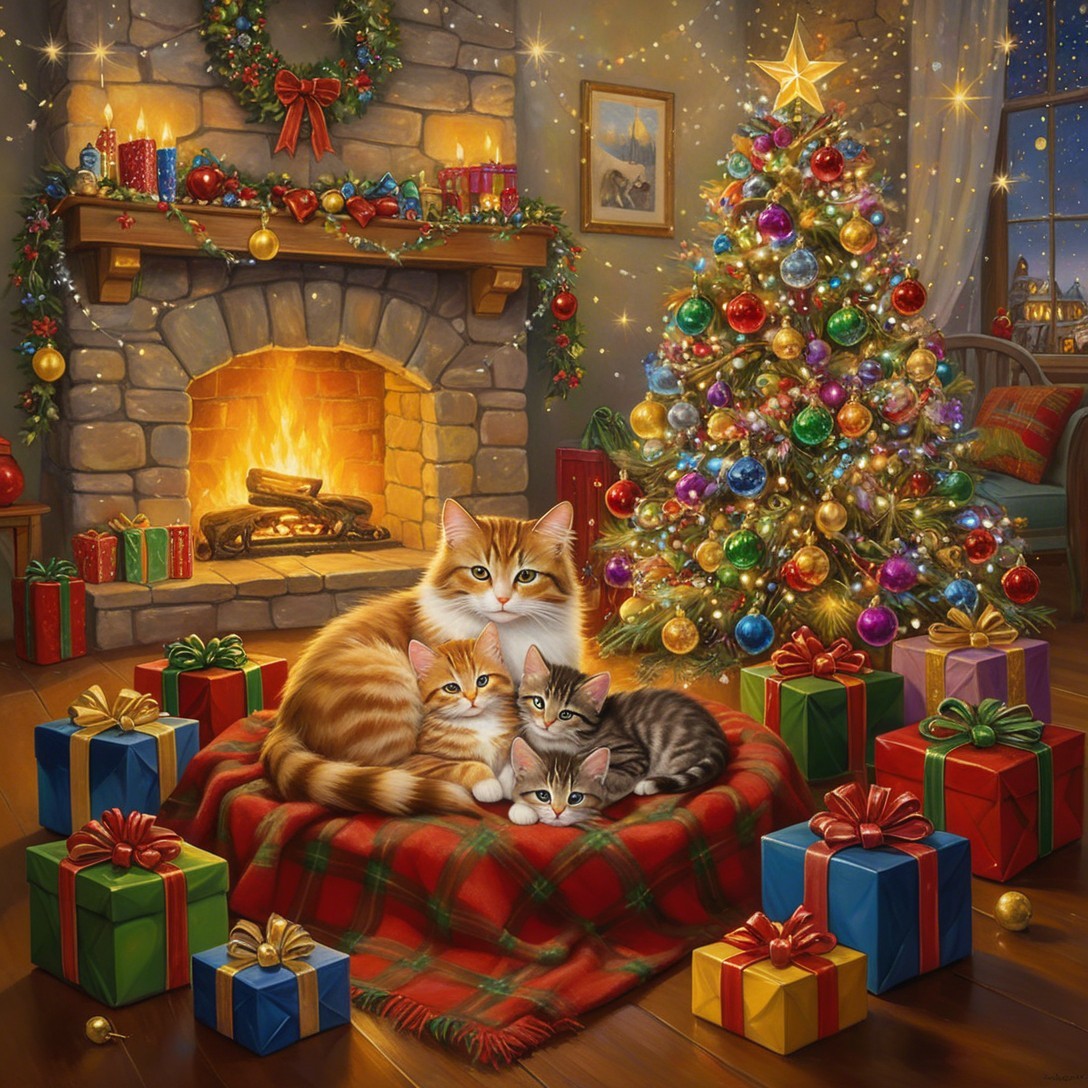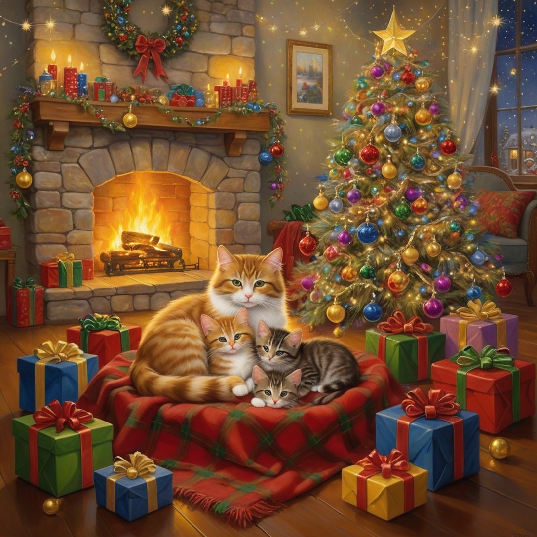 A cozy Christmas scene, with a big Christmas tree with a star at the top, glowing lights, and colorful ornaments, a mother cat with her three kittens laying on a red and green plaid blanket, a fireplace with a lit fire, Christmas decorations including wreaths, garlands, candles, and ornaments, and Christmas presents.