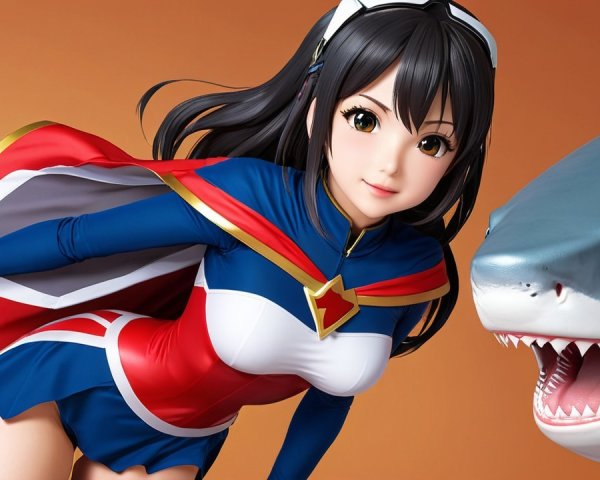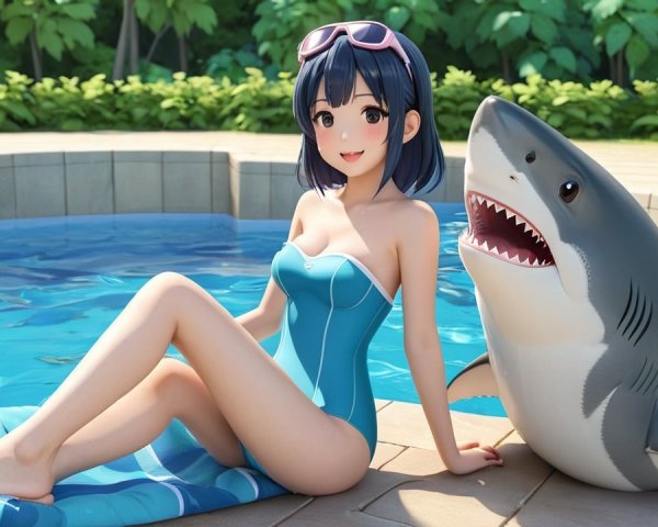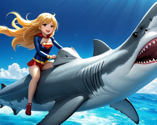 A whimsical scene unfolds as an adorable magical catgirl, with sparkling eyes and playful ears, confidently rides a majestic shark through vibrant ocean waves, blending fantasy and adventure.