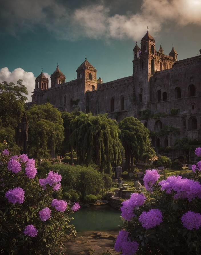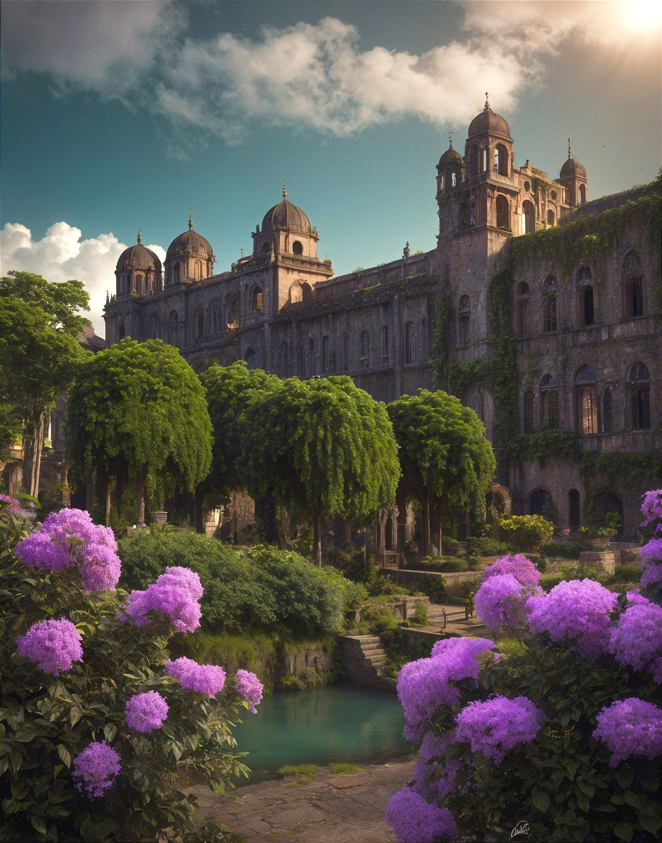 A majestic, ancient palace cloaked in greenery stands beside a tranquil pond. Vibrant purple flowers bloom in the foreground, and soft sunlight bathes the scene in a warm glow.