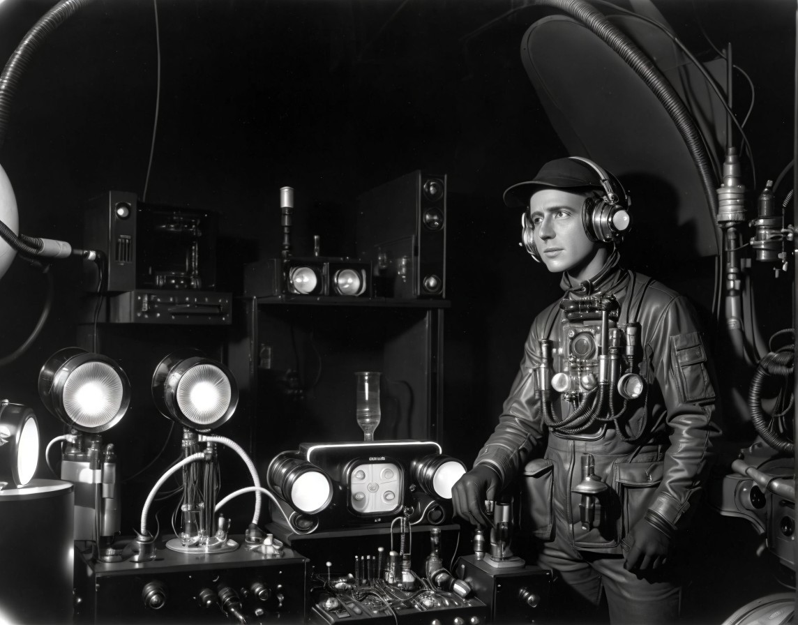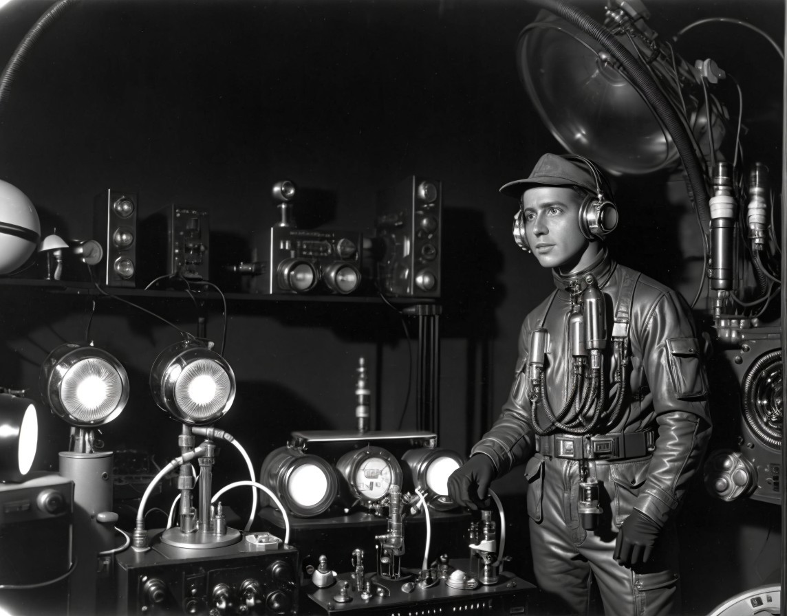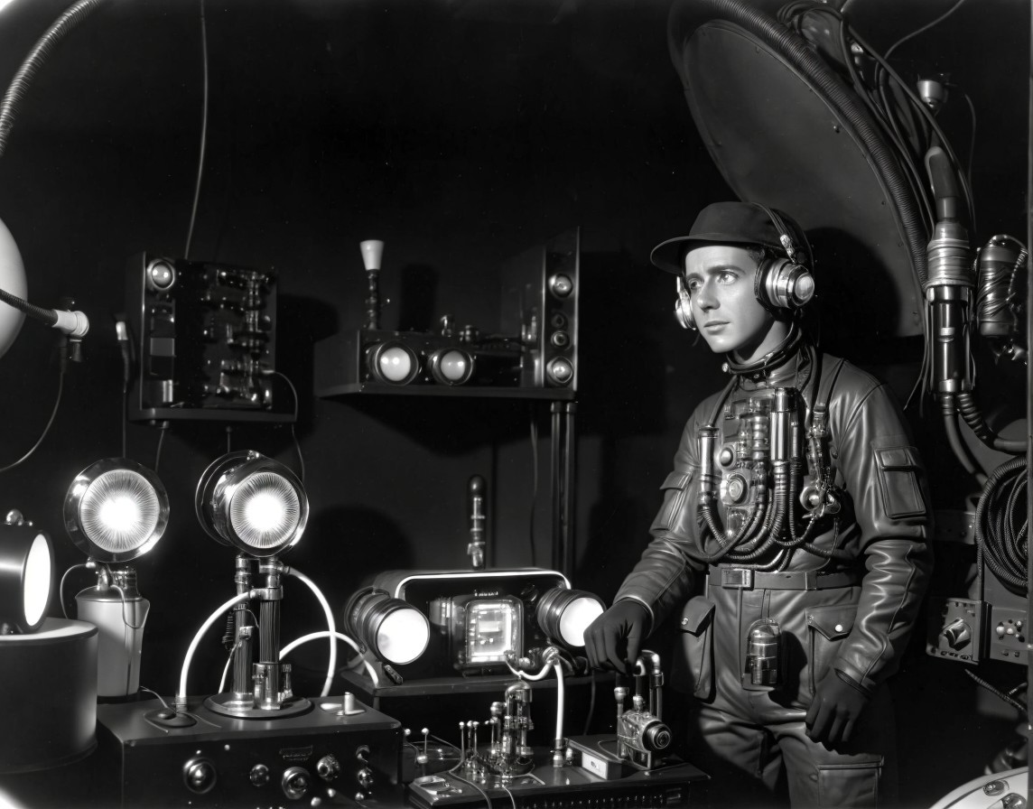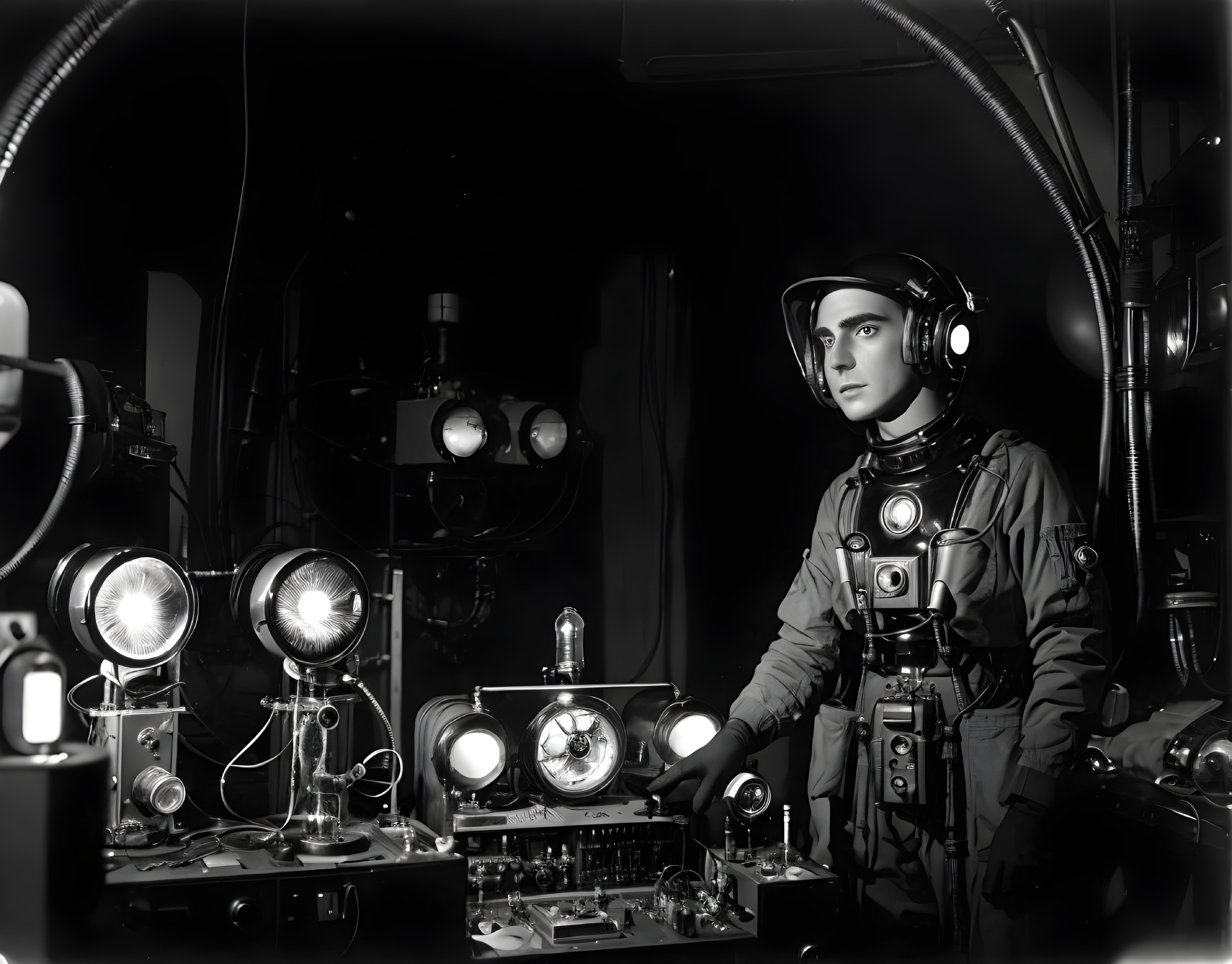 Prompt: "A scene from a 1930 science fiction movie, black and white, daguerreotype, sci-fi, circuit boards, tubes,cables, dirt, an actor in a vintage space suite"
