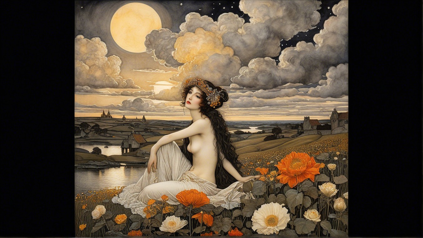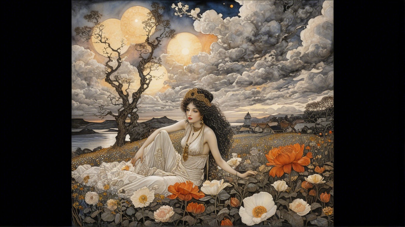 A stunning portrait of a woman with long hair, wearing vibrant orange attire, gazes over a serene landscape at sunset. Rolling hills and a river reflect the colors of the sky.
