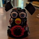 A quirky, whimsical robot owl with large, expressive eyes and playful red ears. Its body features colorful buttons and cameras, showcasing a mix of technology and charm. Perfect for a fun decor piece!