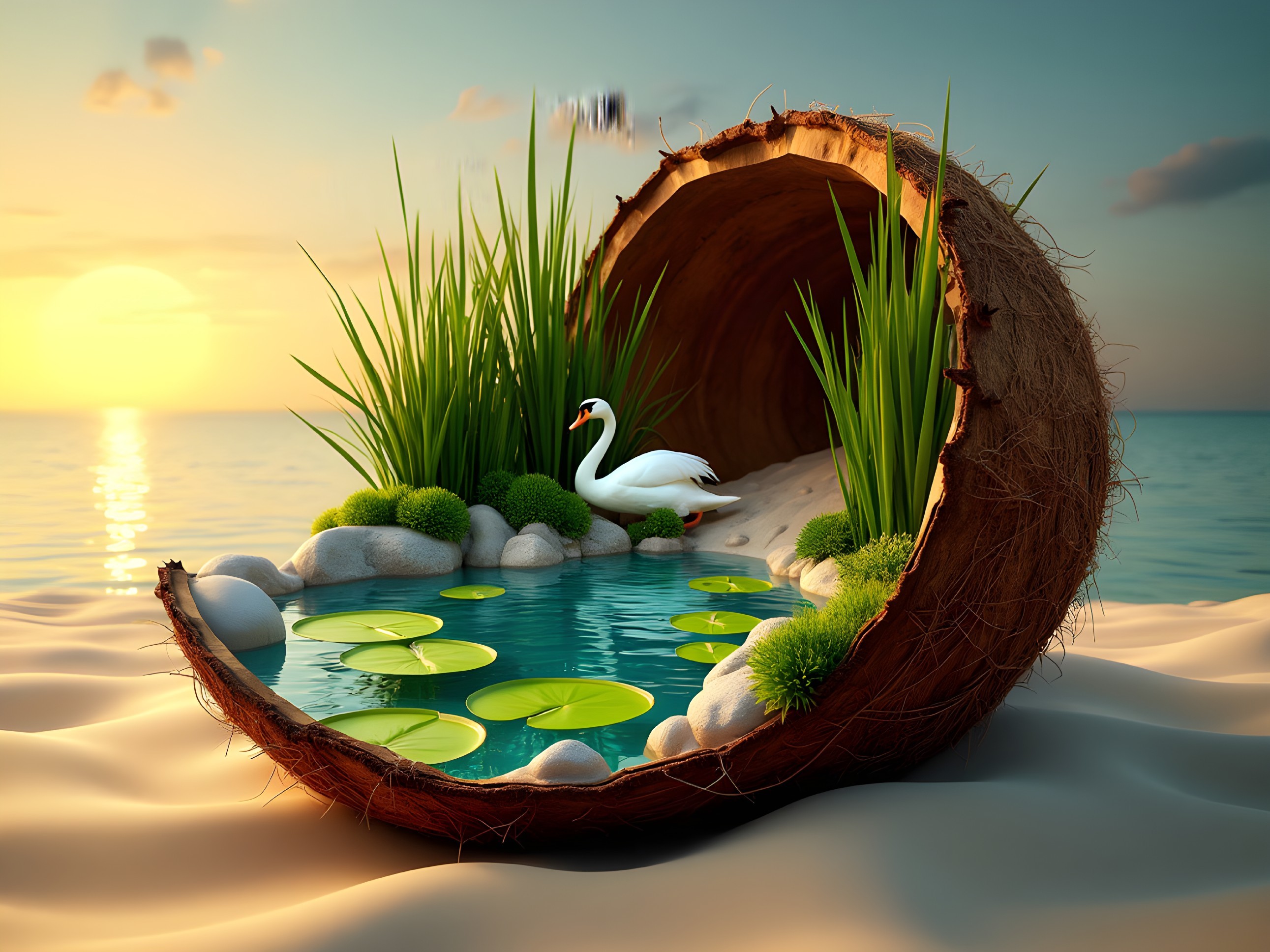 A serene scene: a swan swims inside a coconut turned into a mini-pond amid a tranquil beach setting at sunset.