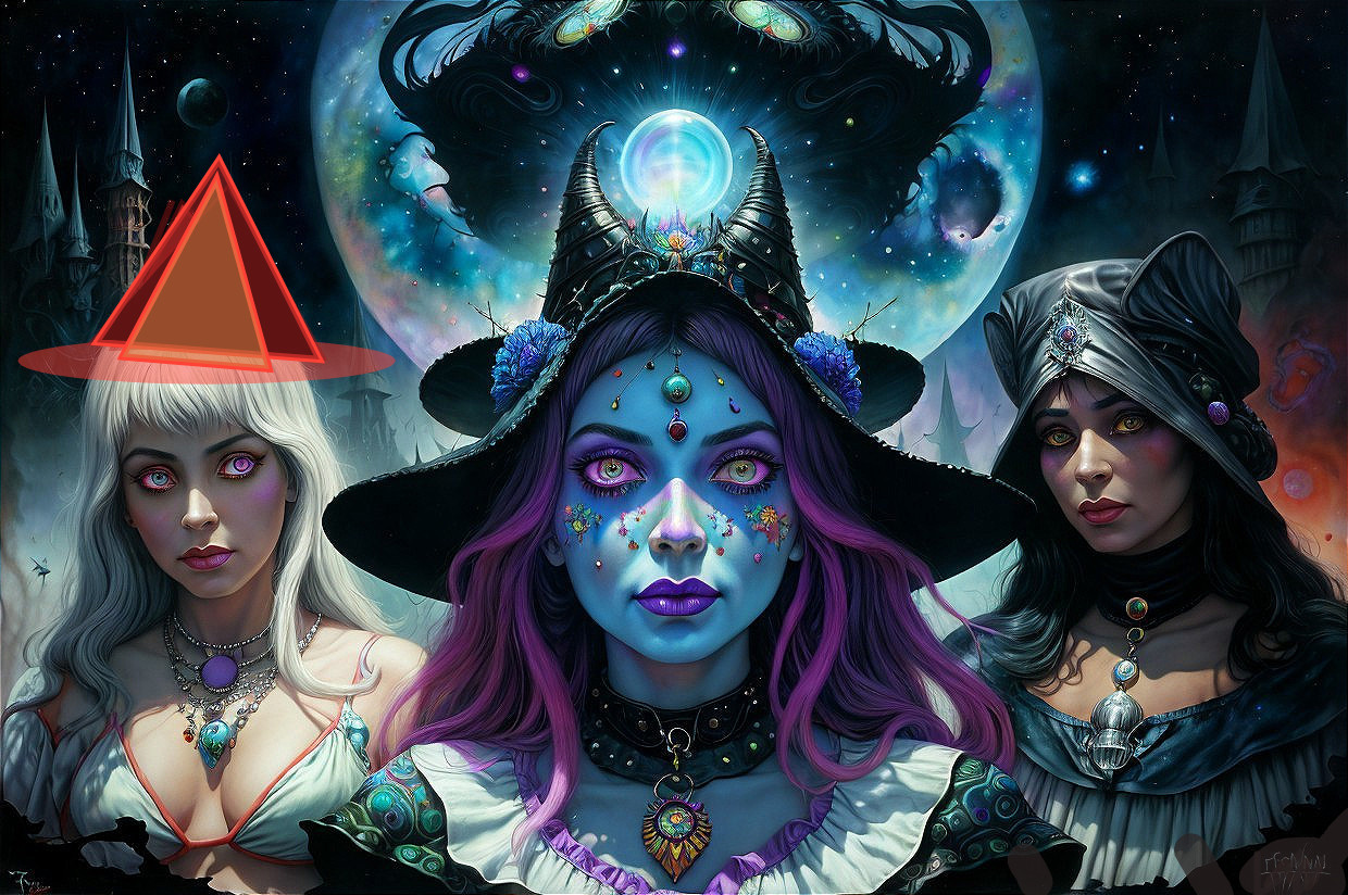 Prompt: Weird beautiful witces with cosmic hats and wild giant eyes, , hellish psychedelic colorful background, mixed media, by Frank Frazetta, Dave McKean and Tove Jansson, small metal paint details by Bill Sienkiewicz