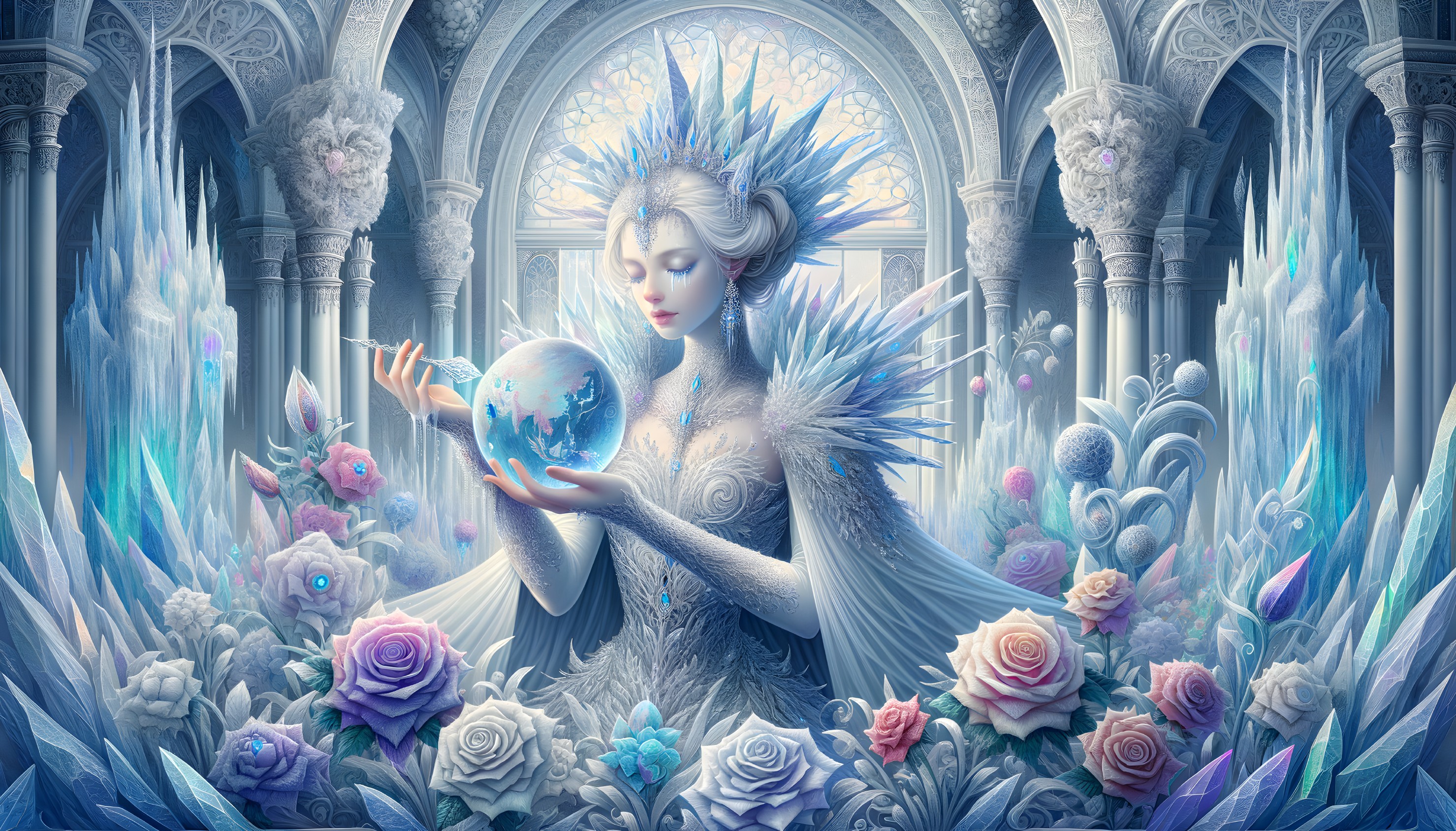 An ethereal figure with a crown holds a glowing orb in an icy, floral-embellished, Gothic cathedral.