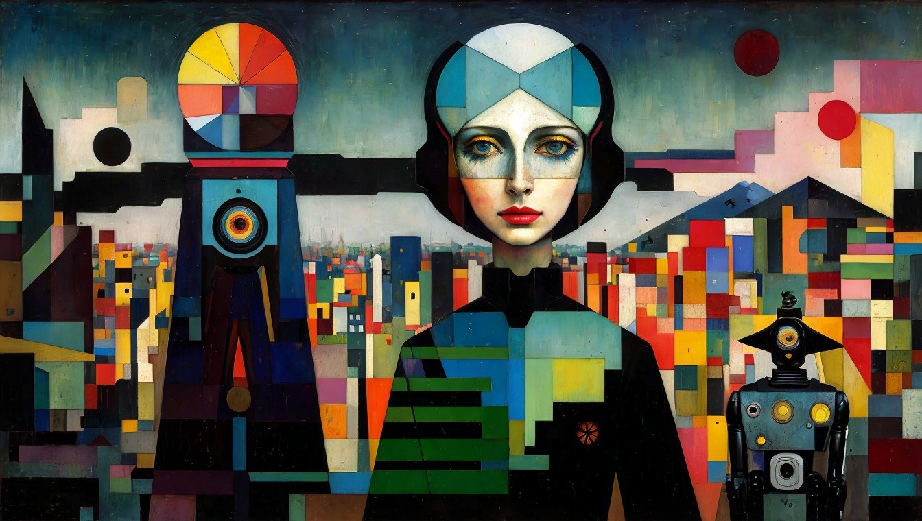 Colorful Composition with Three Figures and Abstract Cityscape