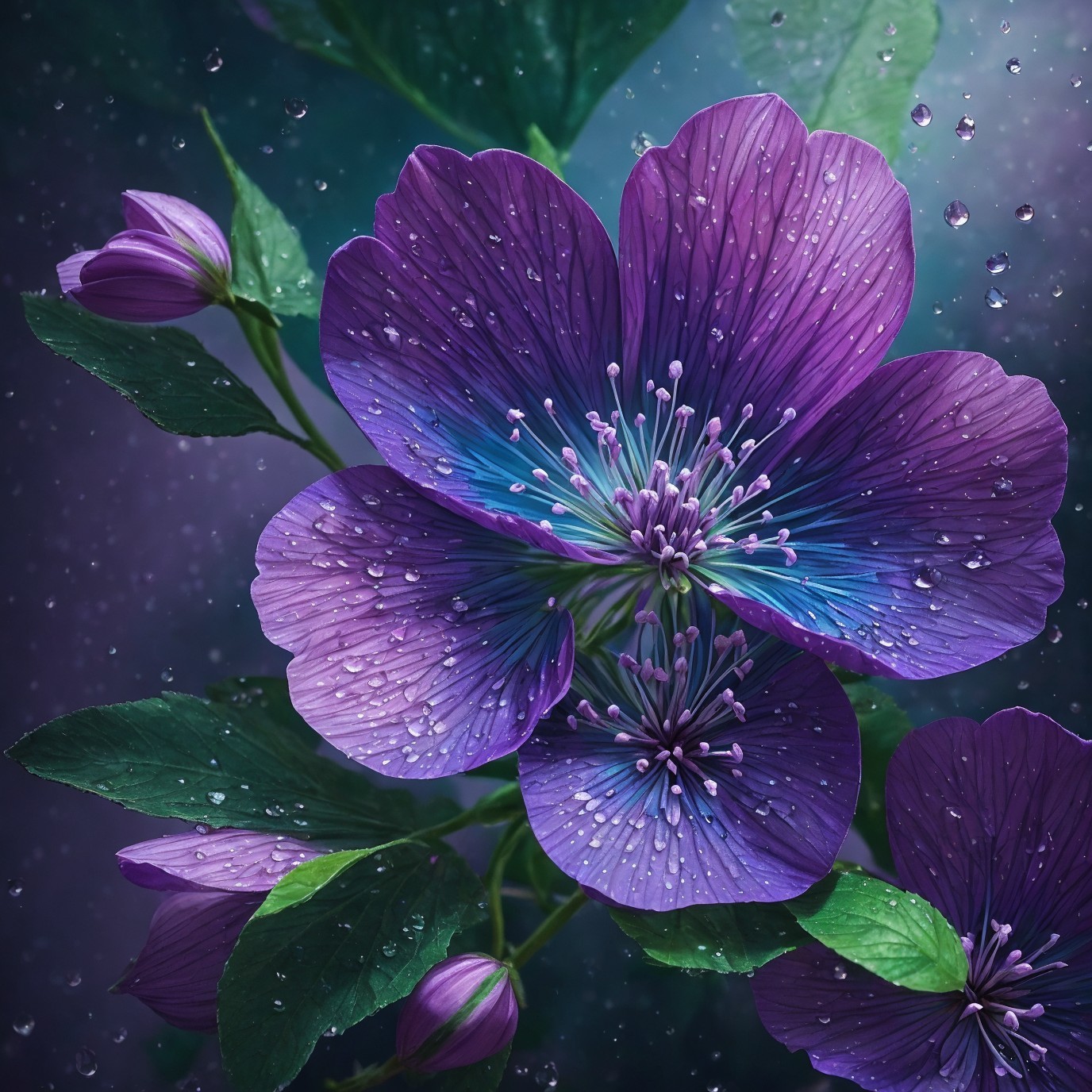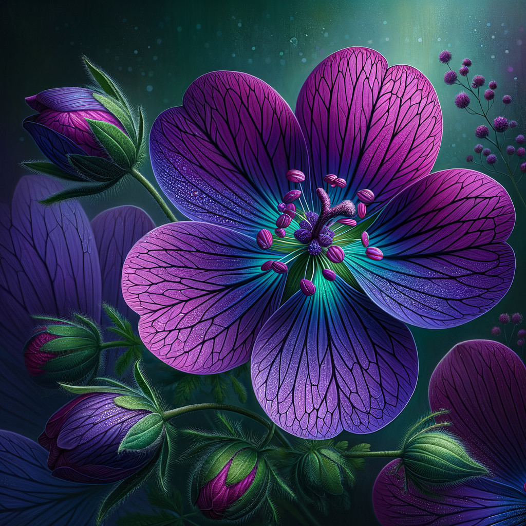 A vibrant purple flower with luminescent speckles and buds against a magical, sparkly teal background.