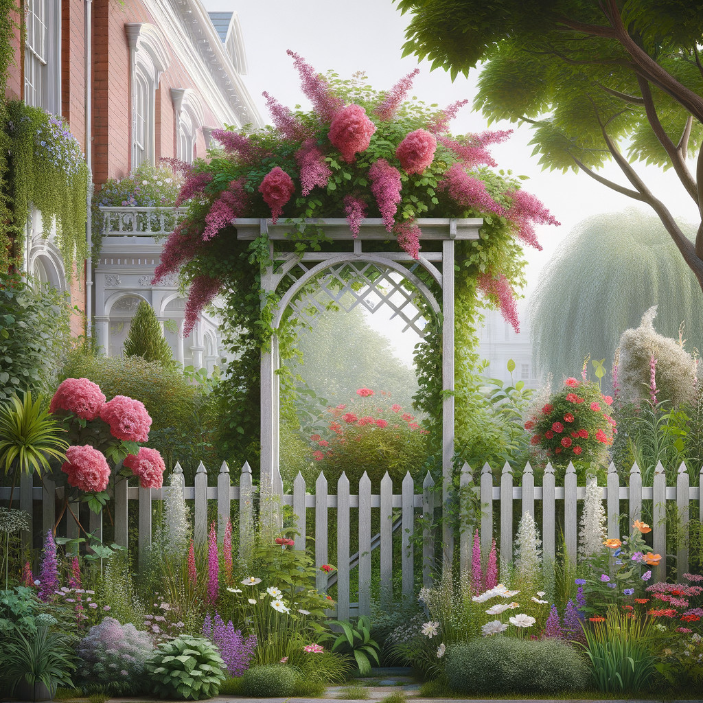 A lush garden archway blooming with pink flowers, framed by a white picket fence and verdant shrubbery, leading to a red house.