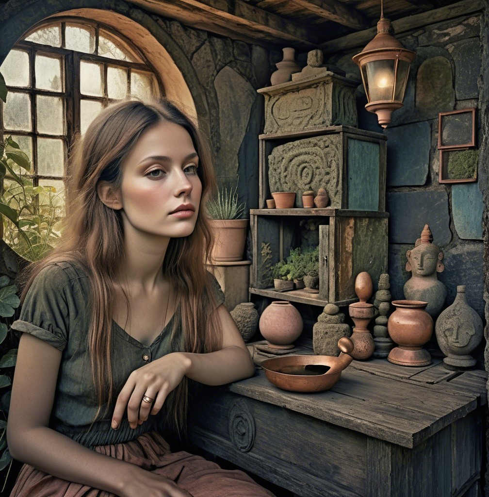 A young woman with long, wavy hair sits thoughtfully beside a stone table adorned with clay pots and sculptures, framed by a cozy stone room filled with greenery and a painted backdrop.