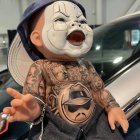 A cute baby with a serious expression sports a stylish hat and a t-shirt with a skull design, sitting in front of a car with an intriguing background of colorful signs.
