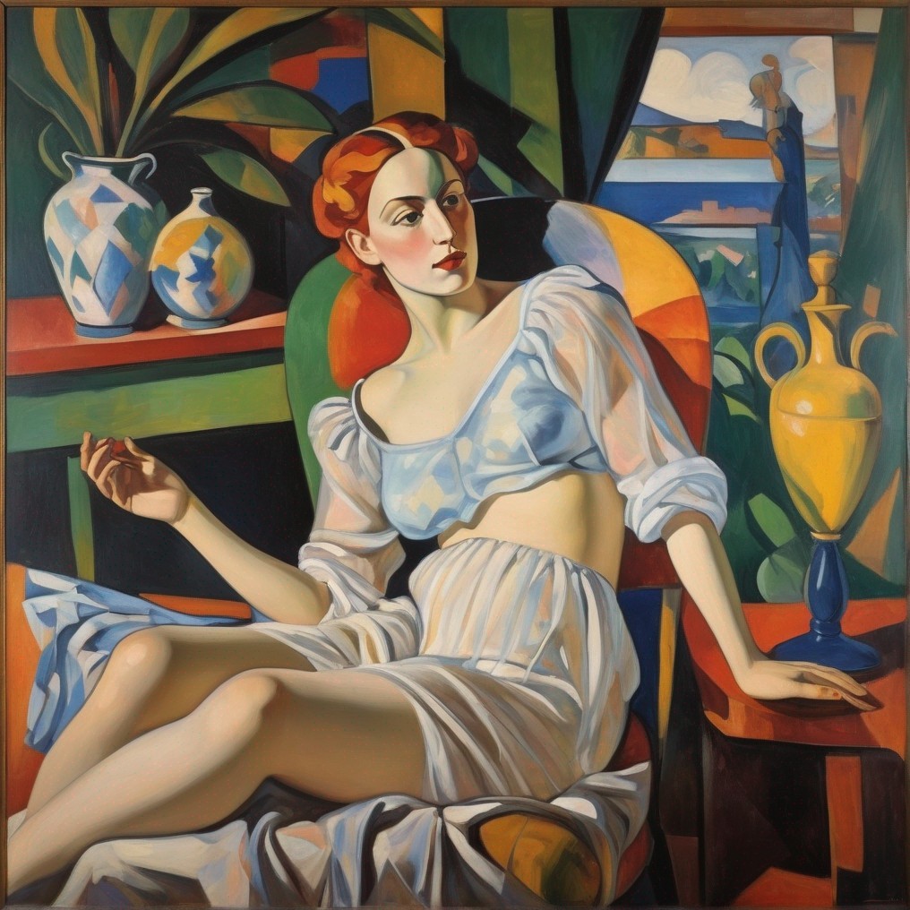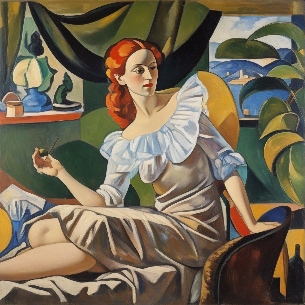 A painting of a woman in white, sitting with fruit in hand, amid geometric shapes and vibrant colors, evoking a Cubist style.