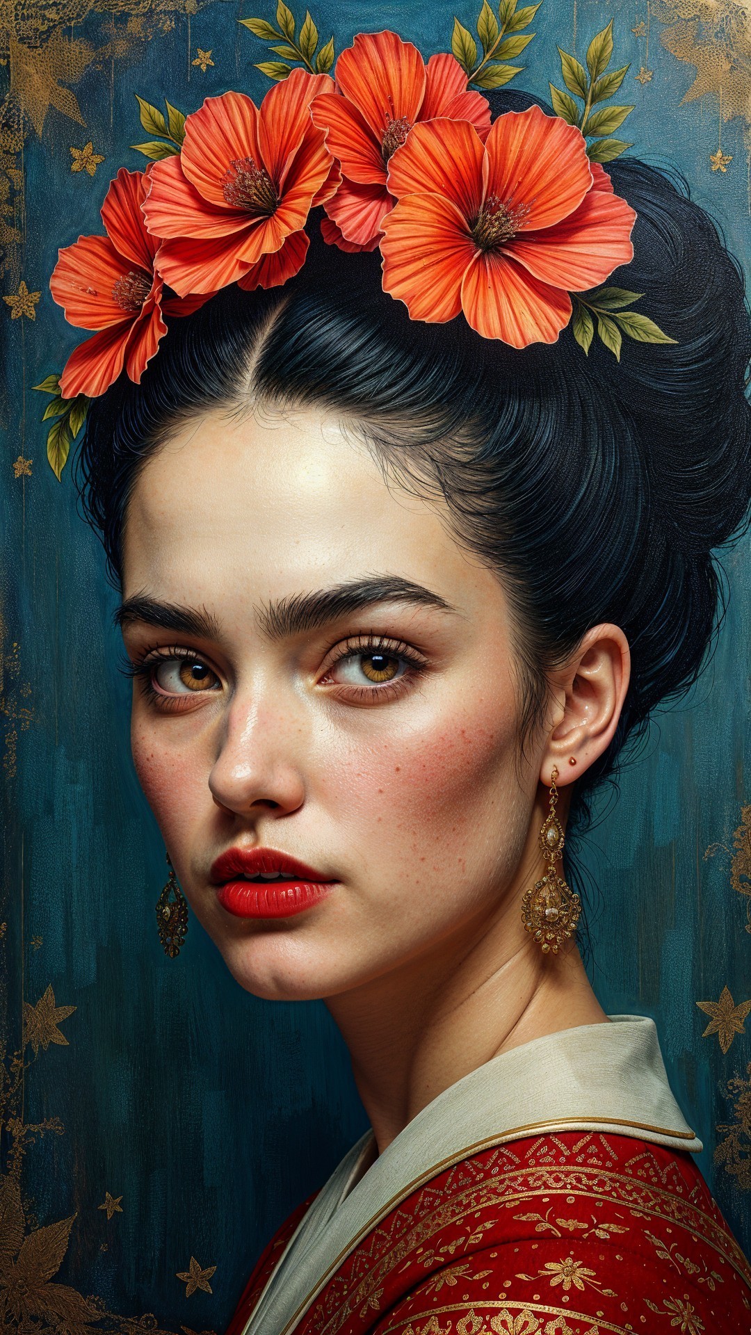 A woman with elegant blue hair adorned with vibrant orange flowers wears striking red earrings. Her makeup features bold orange accents, set against a richly patterned red garment.