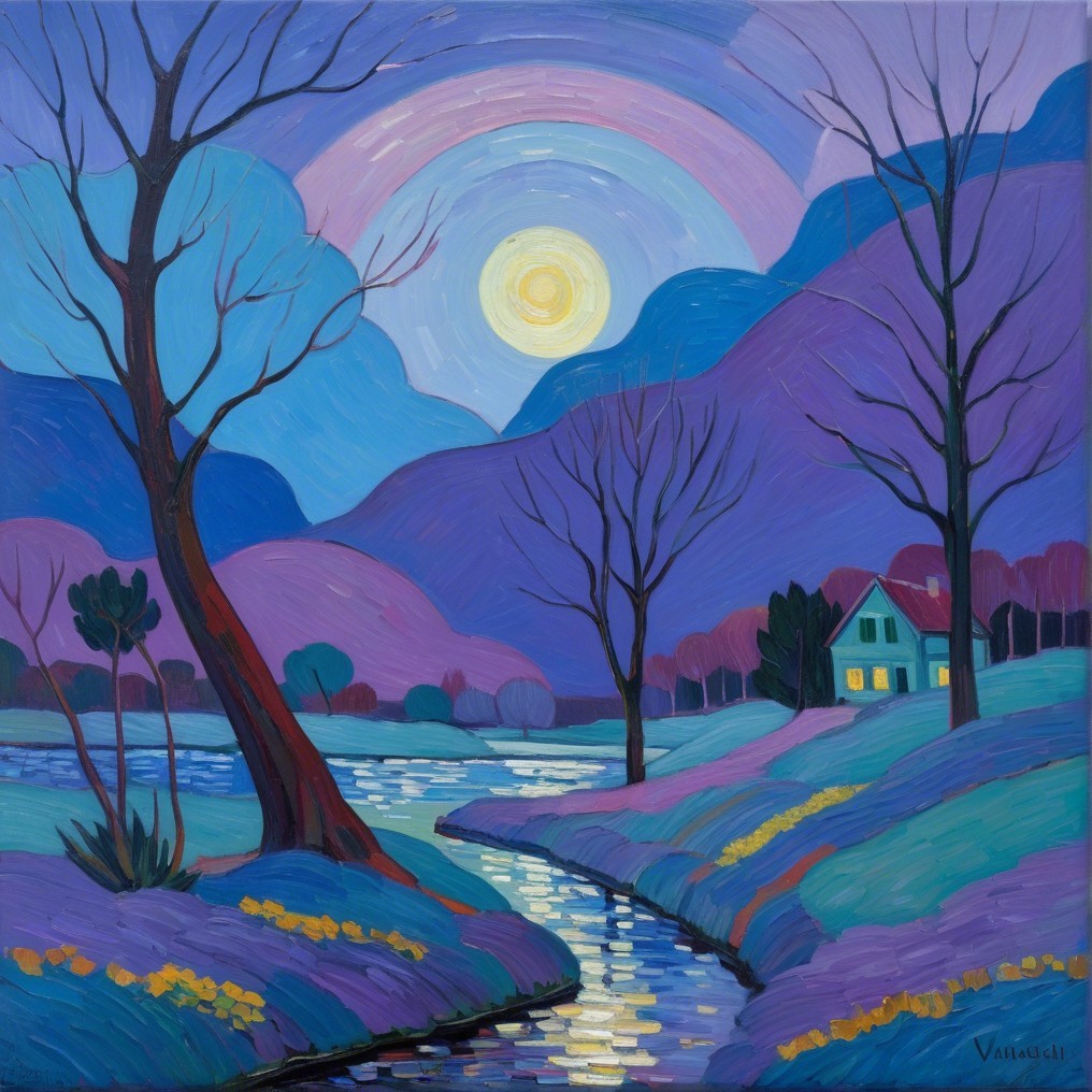 A vibrant, impressionistic landscape features a serene river winding through colorful blooms, with a cozy house under a glowing moon and dramatic clouds, creating a tranquil evening atmosphere.