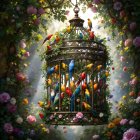 A beautifully crafted black birdcage houses vibrant, colorful birds. Surrounding it are blooming roses and softly falling petals, creating a serene, enchanting garden scene.