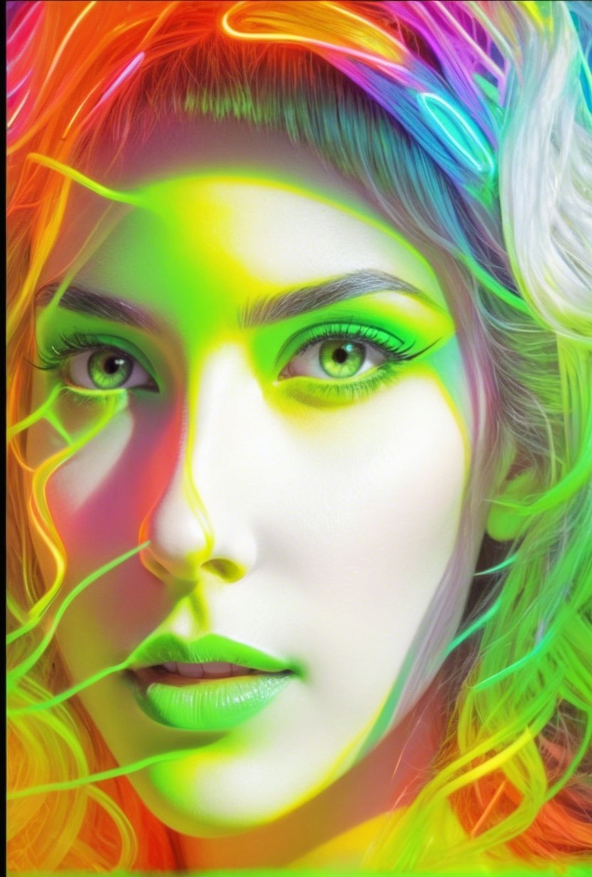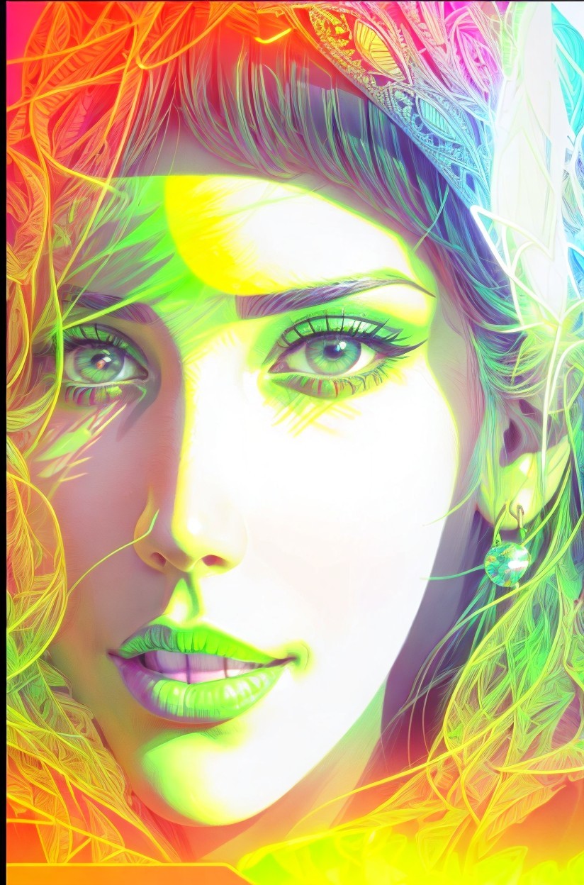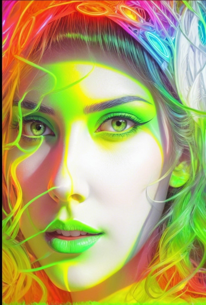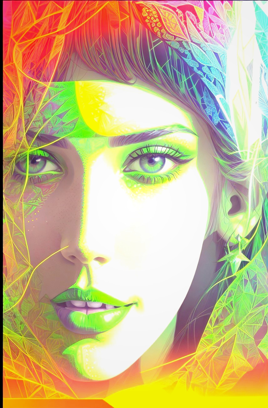Vibrant surreal line-art, stylized portrait by Stan Lee, overexposed neon-art, female headshot, vivid fluorescent colors, forestal-green, neon-green, intricate continuous line technique, close-up, surreal intricate linework with glowing accents, masterful surrealism, fragmented surrealism elements, surreal juxtaposition, magical and enchanting atmosphere, alluring and fantastic elements, vibrant colors, whimsical, floating islands, cascading intricate patterns, hidden liminal details, mysterious fantasy, high resolution, dynamic lighting creating a mystical ambiance. angled view, fine neon linework, high-resolution digital art, focus on texture and contrast, sleek and modern style, dynamic lighting to enhance the depth and dimension of the artwork. Synthwave reference, geometrical motif, double-exposure effect, liminal, warm coloring, multi-layered, action painting in great depth and scale, tall and lean details, pointilism reference, fractal theme, triadic color scheme metallic-honey deep-grenn light-magenta, mip-mapping 1.3,, phong shading 1.2, parallax occlusion 1.3, vibrant line-art by William Bradley, hues by Ho Baron and Ed Emshwiller, dappled rim lighting, smeary, surreal aesthetics by David Graeme Baker, interwoven textures, voluminous collagraphy print, reminiscent of coloring by Gerald Brom. 128K HDR, avant-garde artwork, strikingly colorful, brightness 1.7, zentangle, plasticity 1.1, emulsion shifts, dyed, trippy,high coloring, sprayed painture, airbrush technique, wet-on-wet effect, stacked-up perspective, headshot with dotted and chiseled facial features & multi-layered eyes, hues by Ho Baron, color glitch patchwork features, disintegration of colors, gradient inking, contoured inkpunk, visibly stippled textures, novelty architecture, texture mapping 1.3, color glitch details, intricate linework, captivating coloring techniques, invisble transpositional aperture, shifted lighting, ethereal, brightened coloring, multi-layered eyes, headshot, ultra-high definition, acrylic and ink fusion, stylized masterpiece, resolution 128k, coloring and lighting by Henri de Toulouse-Lautrec,, pointilism art remniscence, dyed, juminocore vibes, spectacular, fractured displacement mapping 1.2, ambient occlusion 1.3, parallax occlusion 1.3, flecks and splashes, comic book art, griddled iconography, retropunk, cel-shaded, sculpted, futuristic stencil, divisionism,