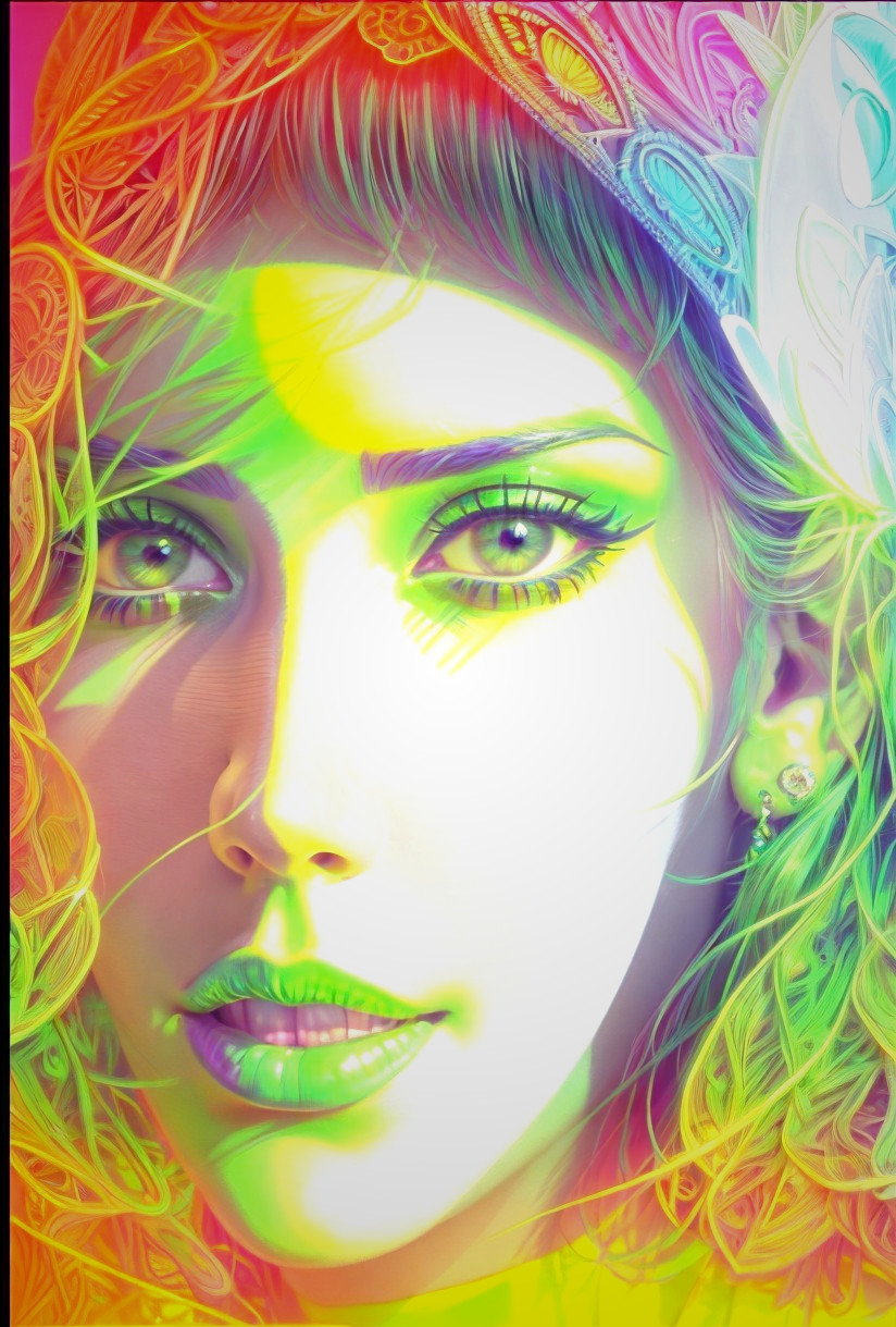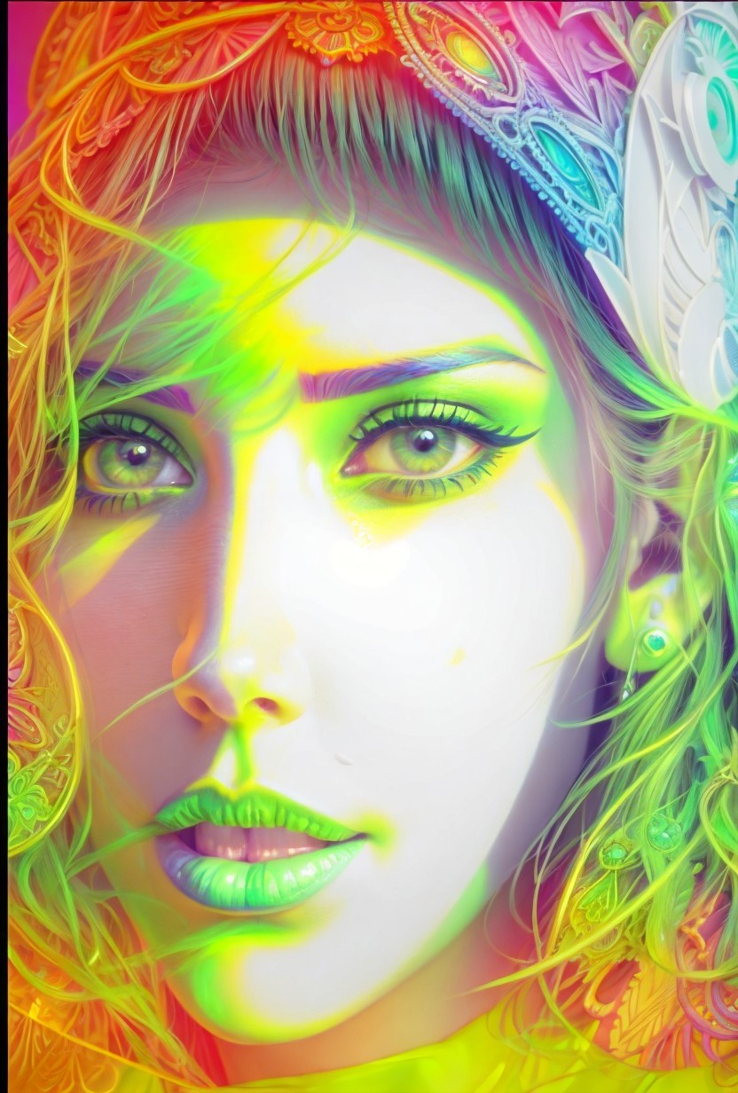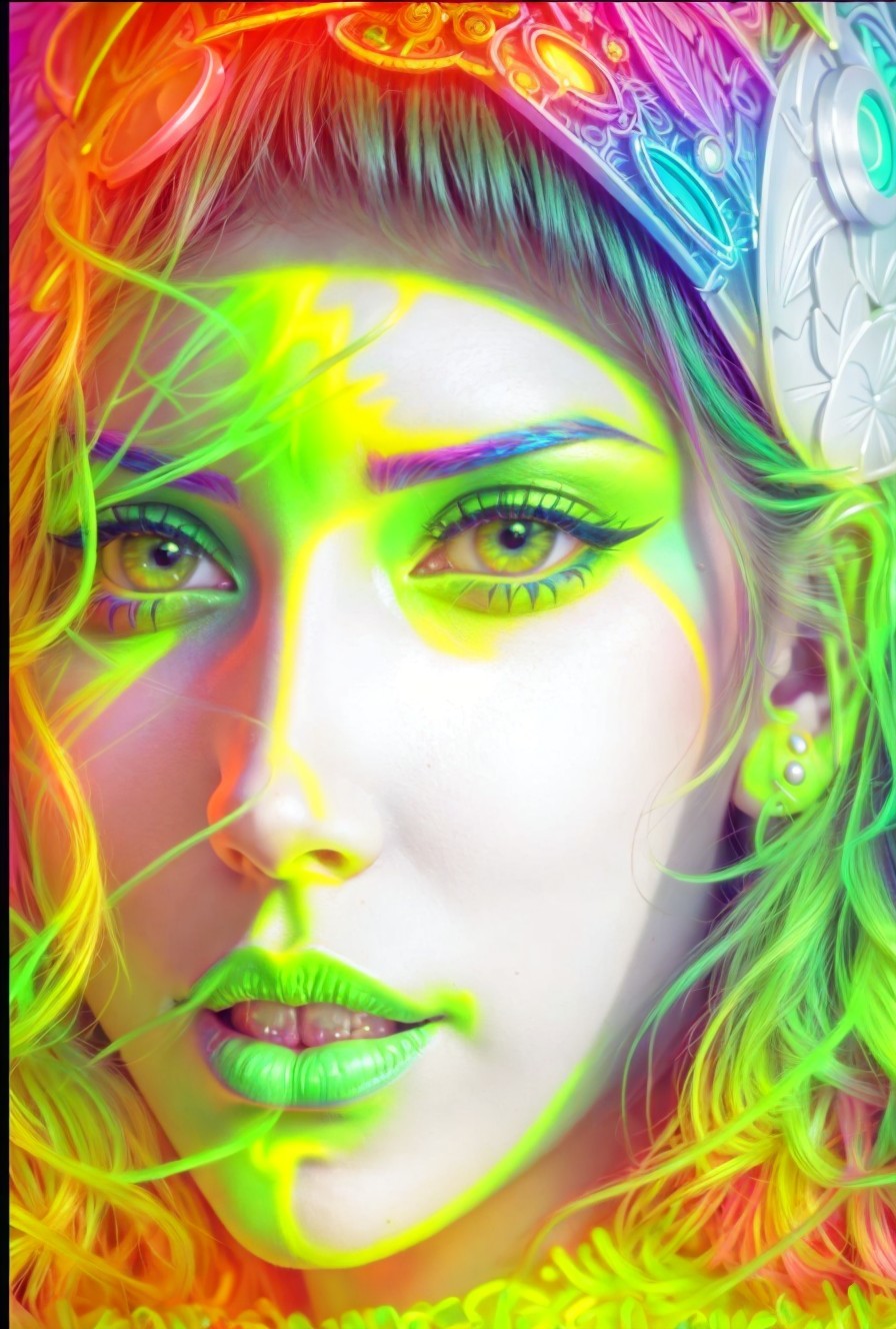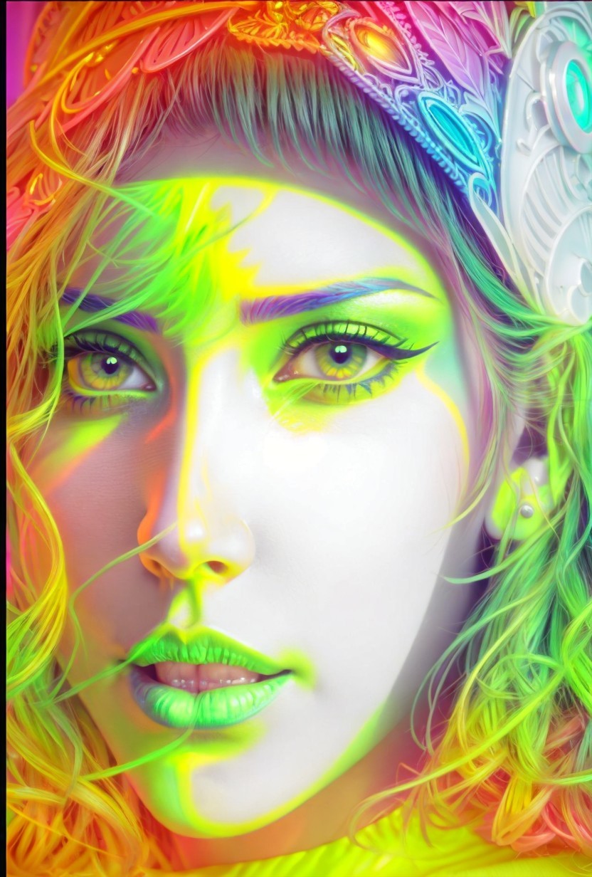 Vibrant surreal line-art, stylized portrait by Stan Lee, overexposed neon-art, female headshot, vivid fluorescent colors, forestal-green, neon-green, intricate continuous line technique, close-up, surreal intricate linework with glowing accents, masterful surrealism, fragmented surrealism elements, surreal juxtaposition, magical and enchanting atmosphere, alluring and fantastic elements, vibrant colors, whimsical, floating islands, cascading intricate patterns, hidden liminal details, mysterious fantasy, high resolution, dynamic lighting creating a mystical ambiance. angled view, fine neon linework, high-resolution digital art, focus on texture and contrast, sleek and modern style, dynamic lighting to enhance the depth and dimension of the artwork. Synthwave reference, geometrical motif, double-exposure effect, liminal, warm coloring, multi-layered, action painting in great depth and scale, tall and lean details, pointilism reference, fractal theme, triadic color scheme metallic-honey deep-grenn light-magenta, mip-mapping 1.3,, phong shading 1.2, parallax occlusion 1.3, vibrant line-art by William Bradley, hues by Ho Baron and Ed Emshwiller, dappled rim lighting, smeary, surreal aesthetics by David Graeme Baker, interwoven textures, voluminous collagraphy print, reminiscent of coloring by Gerald Brom. 128K HDR, avant-garde artwork, strikingly colorful, brightness 1.7, zentangle, plasticity 1.1, emulsion shifts, dyed, trippy,high coloring, sprayed painture, airbrush technique, wet-on-wet effect, stacked-up perspective, headshot with dotted and chiseled facial features & multi-layered eyes, hues by Ho Baron, color glitch patchwork features, disintegration of colors, gradient inking, contoured inkpunk, visibly stippled textures, novelty architecture, texture mapping 1.3, color glitch details, intricate linework, captivating coloring techniques, invisble transpositional aperture, shifted lighting, ethereal, brightened coloring, multi-layered eyes, headshot, ultra-high definition, acrylic and ink fusion, stylized masterpiece, resolution 128k, coloring and lighting by Henri de Toulouse-Lautrec,, pointilism art remniscence, dyed, juminocore vibes, spectacular, fractured displacement mapping 1.2, ambient occlusion 1.3, parallax occlusion 1.3, flecks and splashes, comic book art, griddled iconography, retropunk, cel-shaded, sculpted, futuristic stencil, divisionism,