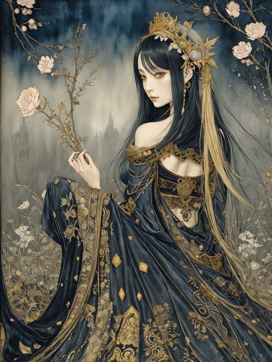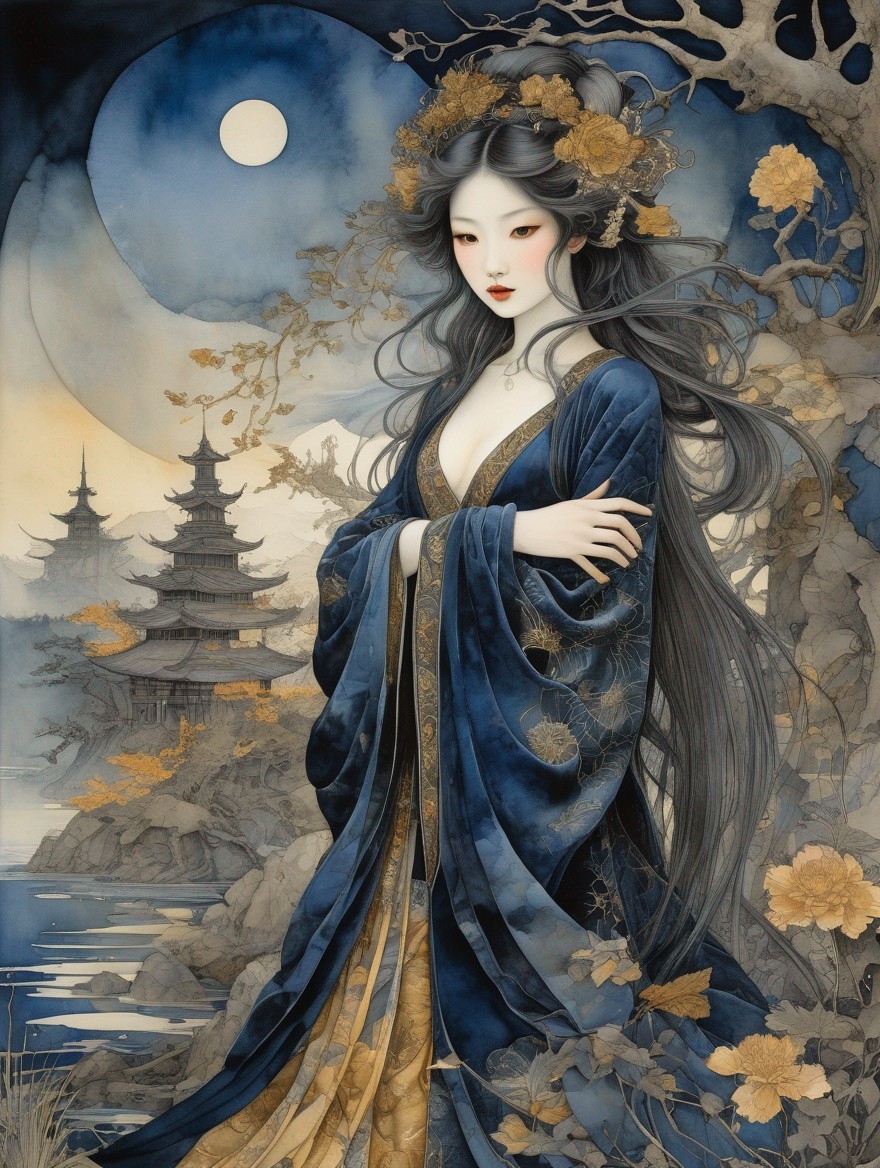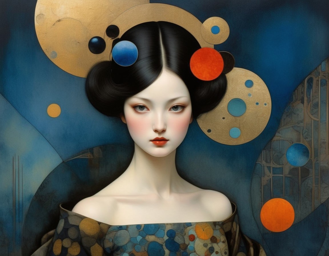A portrait of a stylized woman with traditional Japanese hairstyle and makeup, set against a blue background with gold patterns.