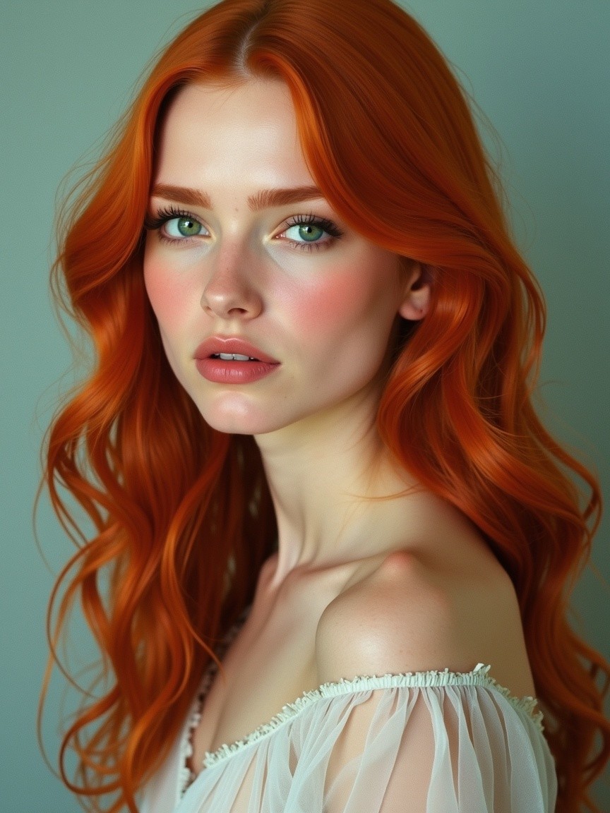 A young woman with striking bright red hair and blue eyes gazes softly at the viewer. Her fair skin is complemented by natural makeup, featuring a hint of peachy blush and lip color.