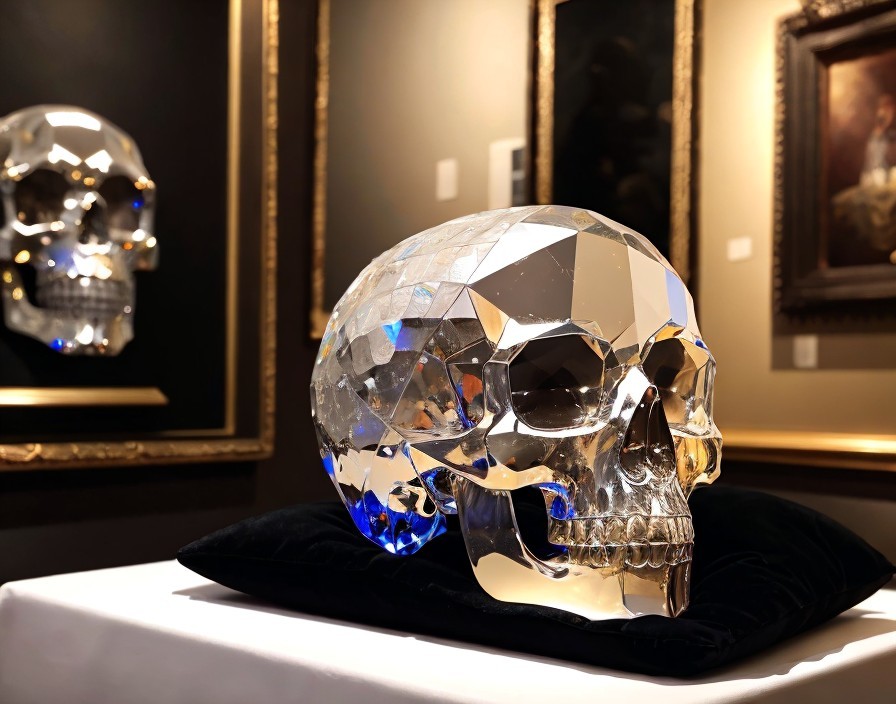 Crystal-embellished skull on black cushion in luxurious, dimly lit setting
